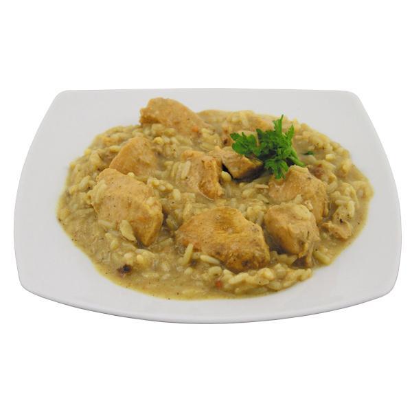 Состав: 37% филе куриной грудки, 20% рис, притьевая вода, пшеничная мука, лук, молоко, сметана, каменная соль, перец, карри, сахар, картофельная мука.