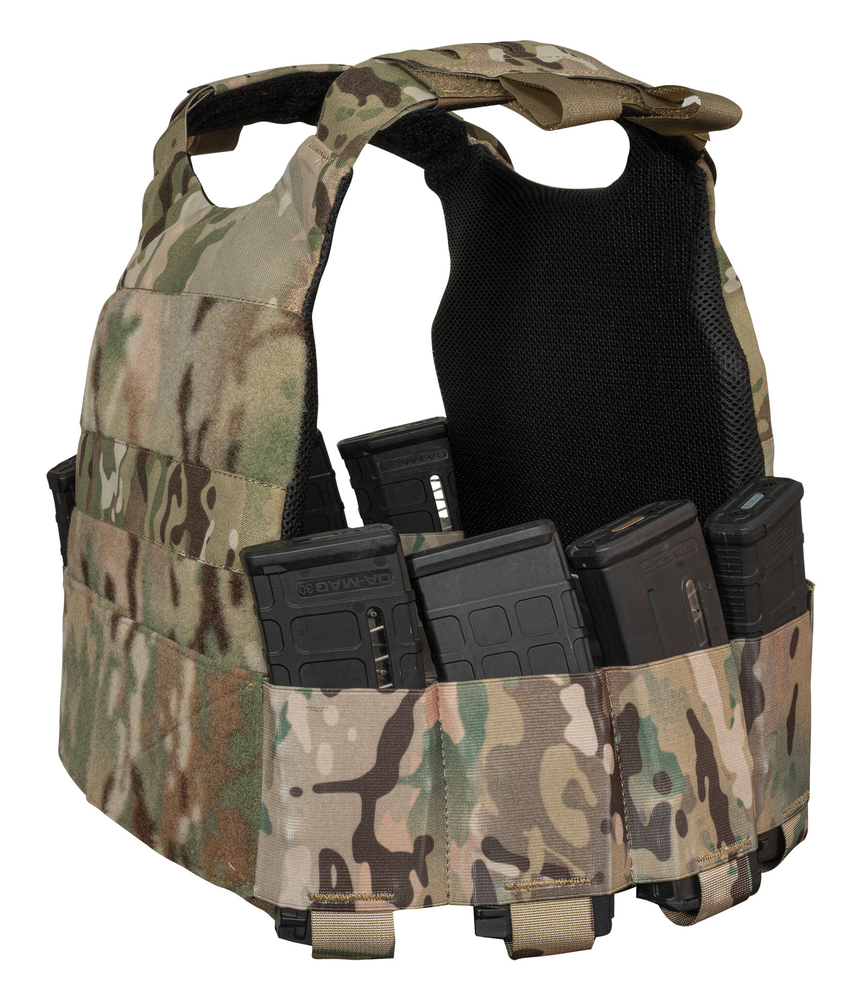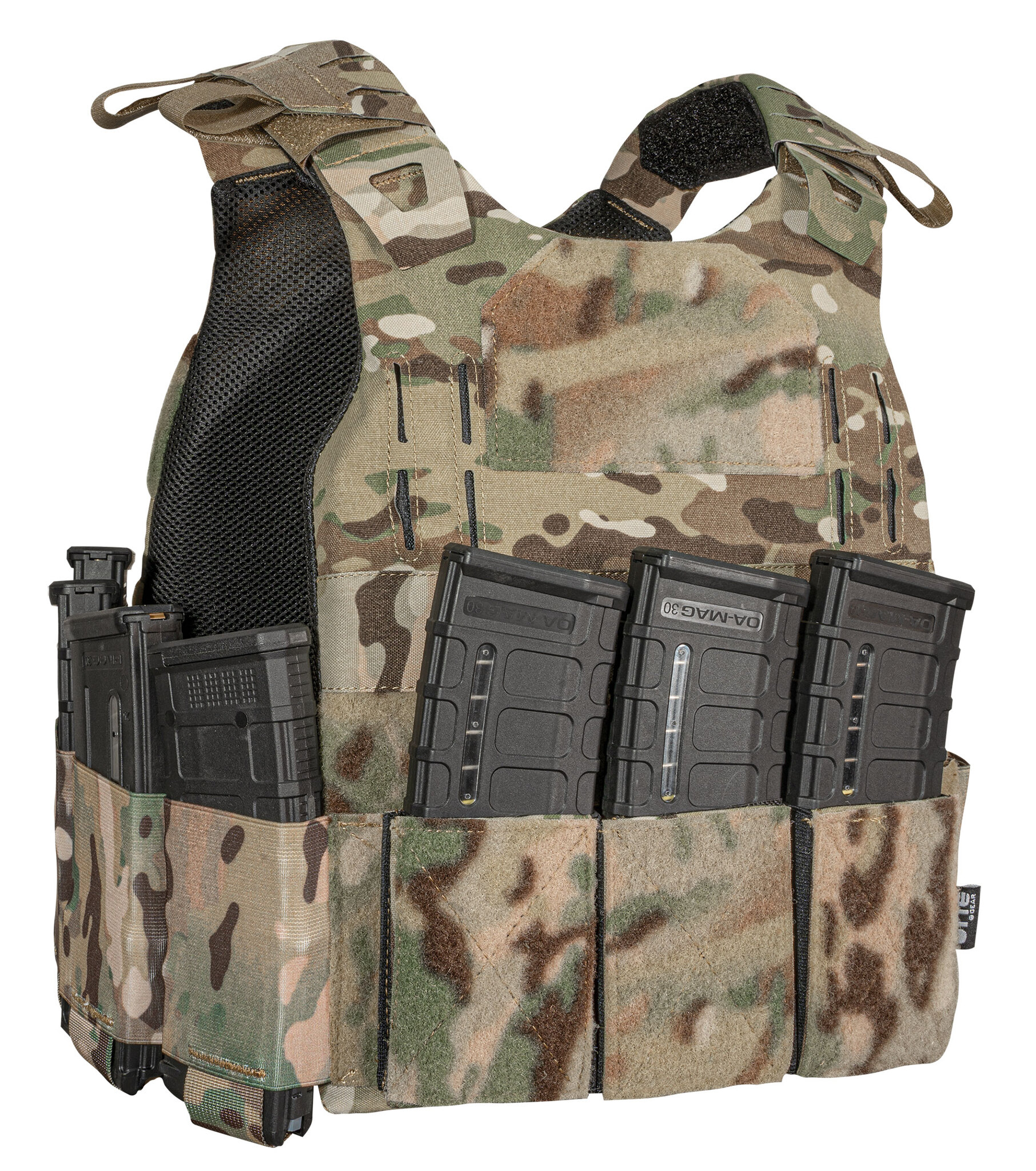 The Plate Carrier LVZ / OVT is a plate carrier designed to hold 10 × 12 hard plates of level III or level IV (MEDIUM SAPI). Due to its design, the LVZ / OVT is extremely flexible and can be adapted to almost any body type. On the front of the plate carrier is a large Velcro area for patch ID, for example. Included are 3 magazine pouches for rifle magazines, which are quickly removable when not in use (Velcro/Fleece connection). The plate carrier has 4 integrated pockets (per side) for IFAK or communication or additional 8 magazines, so you can carry a total of 11 magazines. The interior is lined with breathable mesh. On the back of the carrier is an approximately 25 cm and 7 cm fleece velcro area for patch ID.