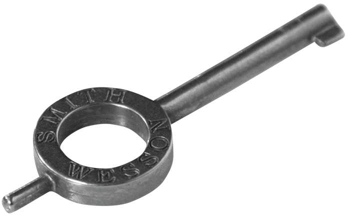 S&W Handcuffs with "Slot Lock Arrest" - the small pin on the back of the included handcuff key is inserted into the elongated slot and moved sideways. This locks the handcuff in place and prevents it from being squeezed tighter around the wrist.