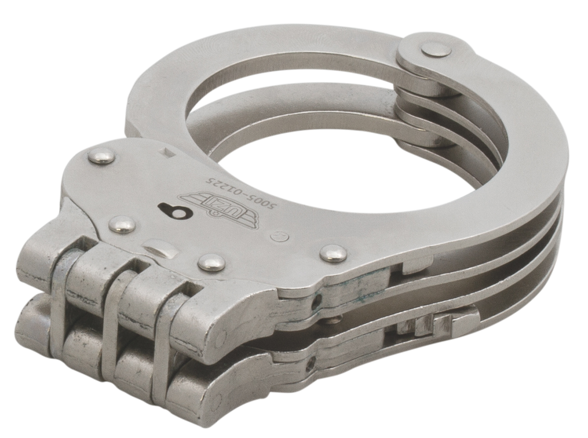 UZI NIJ Approved Hinged Handcuffs are National Institute of Justice (U.S. Department of Justice Research, Development and Evaluation) approved, high-strength stainless steel handcuffs with folding hinge for space-saving handcuff storage, dual locking mechanism and 22 locking positions.