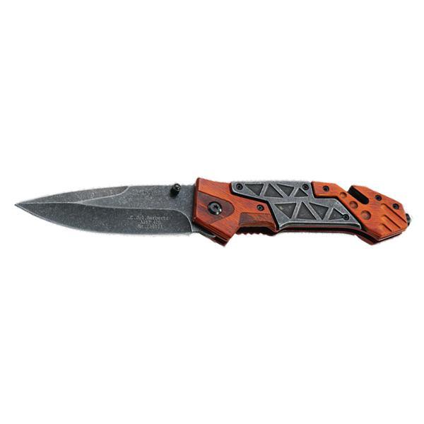 Практичный нож спасателя от Herbertz со стропорезом и стеклобоем. Клинок из нержавеющей стали открывается с помощью кнопки и надежно фиксируется линейным замком в рабочем положении. Накладки рукояти выполнены из комбинации дерева пака и высококачественной стали. Клинок и вставки обработаны методом шлифования.