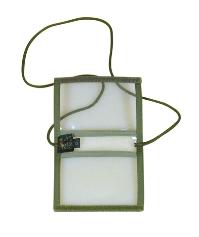 Foldable clear vinyl ID card cover for a minimum of two ID cards in ID card size with adjustable neck strap.