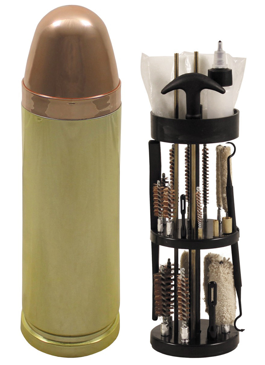 Multikaliber gun cleaning kit in decorative and practical storage box in the shape of a cartridge