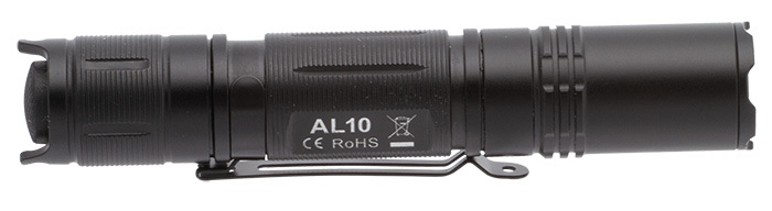 Scope of delivery: AL10 flashlight, rechargeable 14500 Li-Ion battery, detachable belt clip, standard micro USB charging cable, wrist strap, nylon belt holster, operating instructions (English, French).