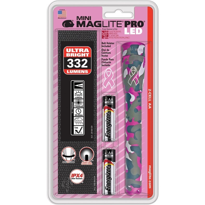 Mini Maglite LED. 6.38" overall. Water resistant. Impact resistant. 332 lumens. 172m beam distance. 2h 30m runtime. Hands-free candle mode. Twist on/off. Color: Pink camo. Requires (2) AA batteries (included). Black nylon belt sheath. Aluminum construction.