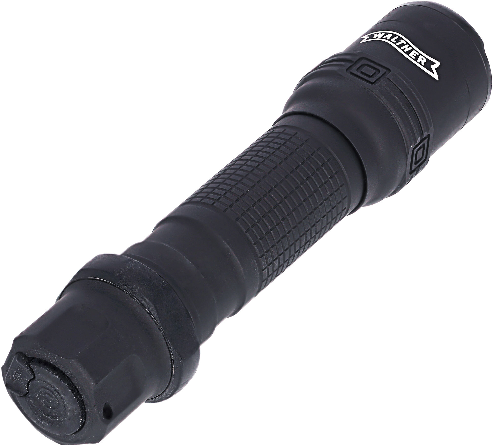 With its consistent orientation as an operational lamp, the rechargeable flashlight distinguishes FlashlightTFC1r from Walther differs in several details from everyday and outdoor lamps: for one thing, the stroboscope mode can be activated without any delay even when the lamp is switched off. Secondly, the arrangement of both switches (main switch for on/off and momentary light, secondary switch for stroboscope and brightness control) at the end of the lamp is designed for maximum intuitive operation.