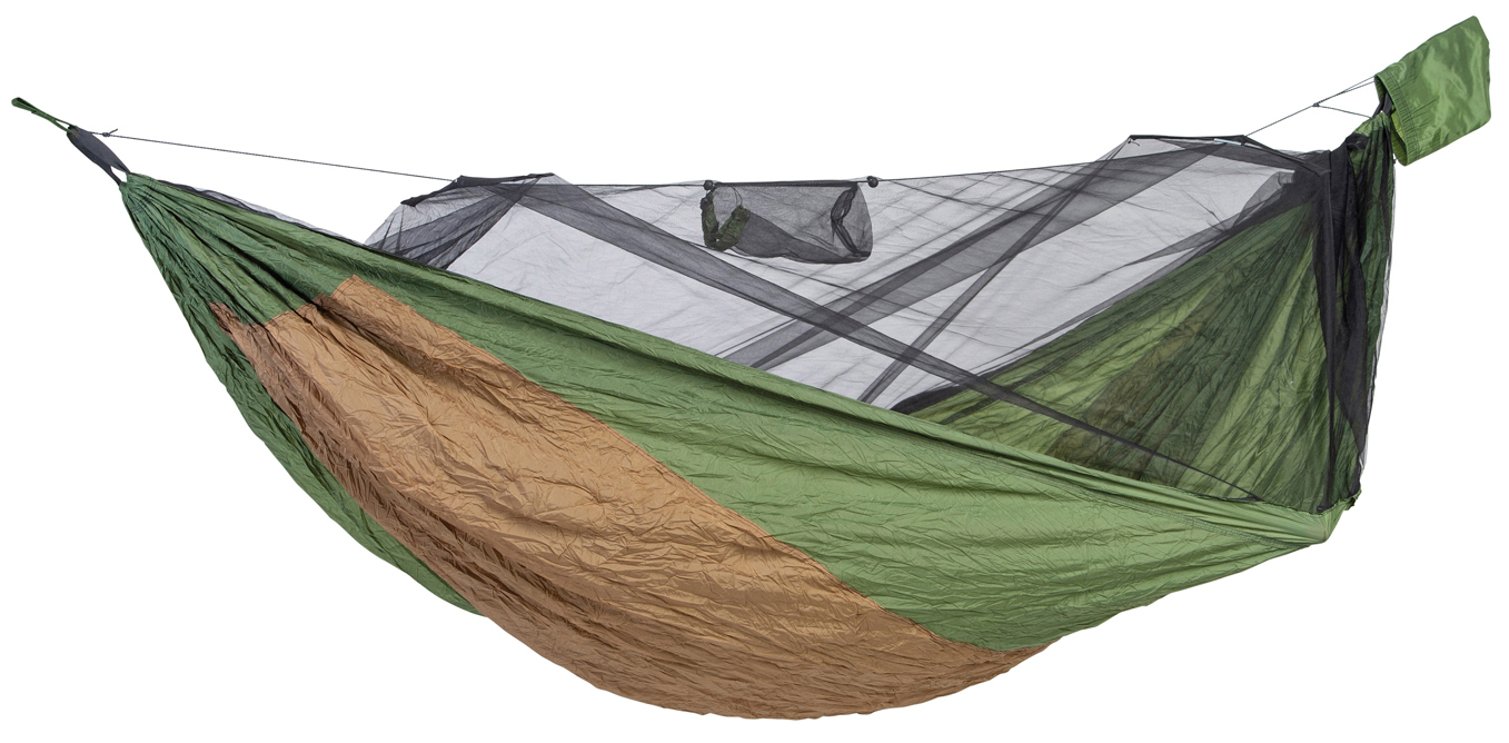 The ultralight Adventure Hero XXL hammock offers an integrated mosquito net and a diagonal compartment for a sleeping pad (sleeping pad not included)