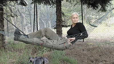 Mil-Tec hammock with wooden crossbars and transport net bag.
