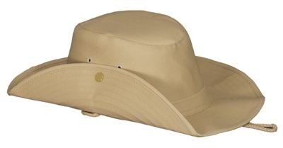Sun protection hat with wide brim in pure cotton that can be folded up on both sides. Adjustable chin strap by drawstring.