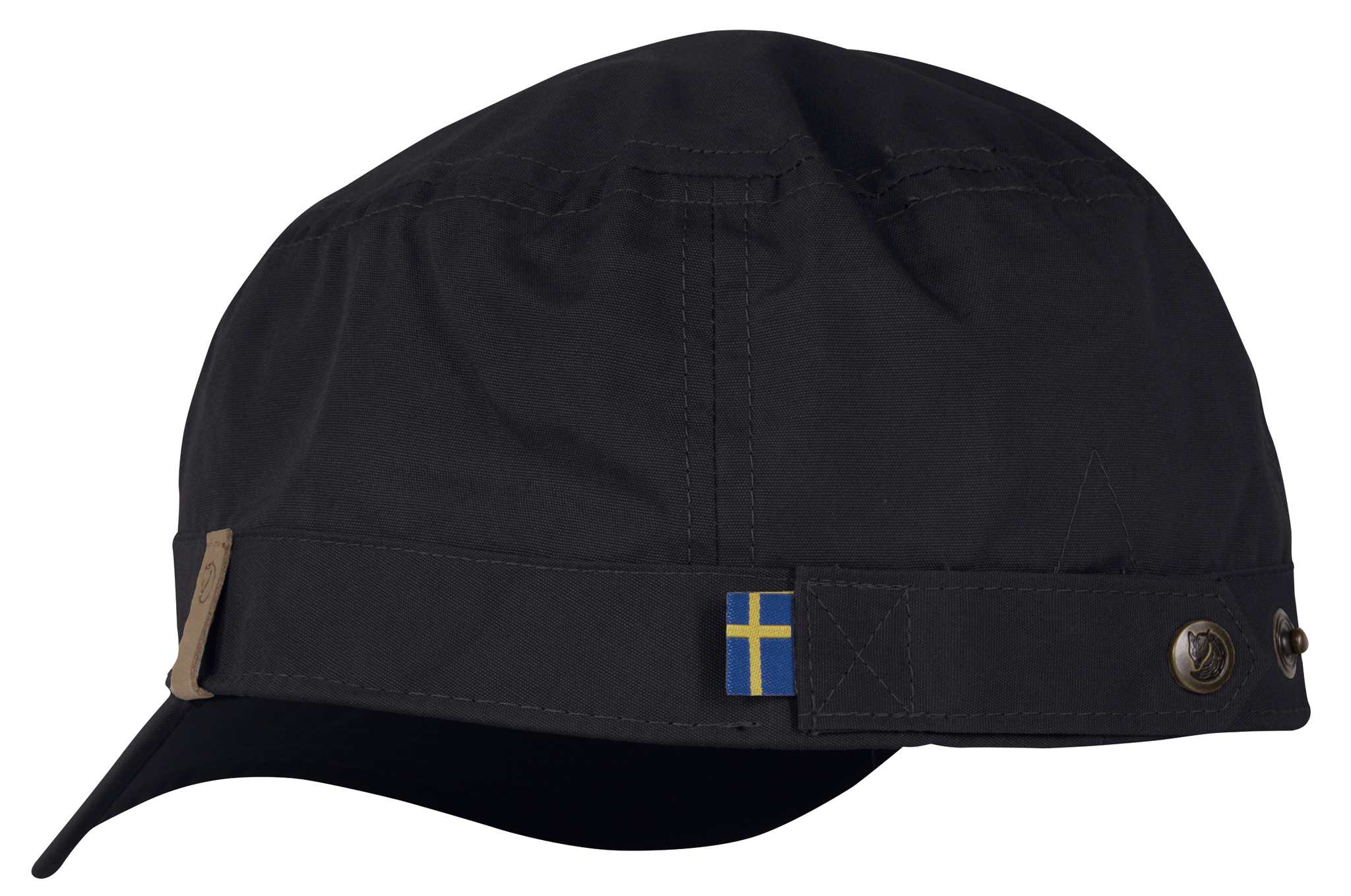 Fjaellraeven Singi Trekking Cap in G-1000 Original with flat top, short peak and button width adjustment at the neck.