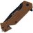 Assisted opening. 4.25" (10.8cm) closed. 3" (7.62cm) black oxide coated partially serrated stainless tanto blade. Brown polymer handle. Thumb stud. Extended tang. Glass breaker. Belt/cord cutter. Pocket clip.