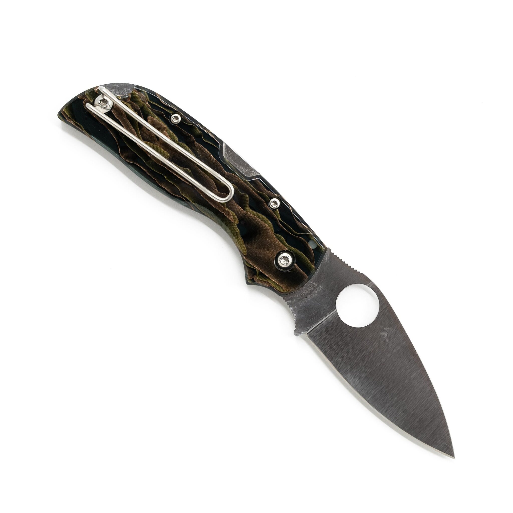 Spyderco’s Chaparral series is a family of slim, pocket-friendly gentlemen’s folding knives that celebrates the diversity of different handle materials and treatments. This unique version of the Chaparral features full stainless steel liners and smoke-colored Raffir Noble scales. Manufactured in Denmark, Raffir is a strikingly beautiful composite material that encapsulates metal mesh in a durable, translucent epoxy resin. The Raffir Noble pattern combines a smoke-colored acrylic with a mixture of brass and copper mesh. When machined and polished to create knife scales, it reveals a unique, semi-transparent, three-dimensional pattern with amazing visual depth and character.