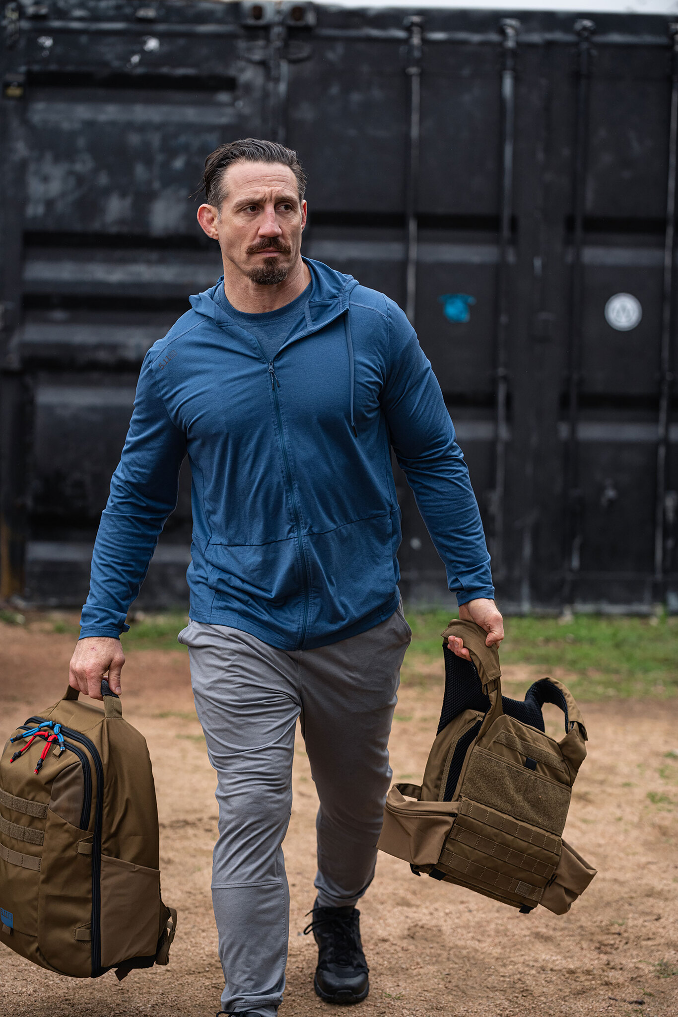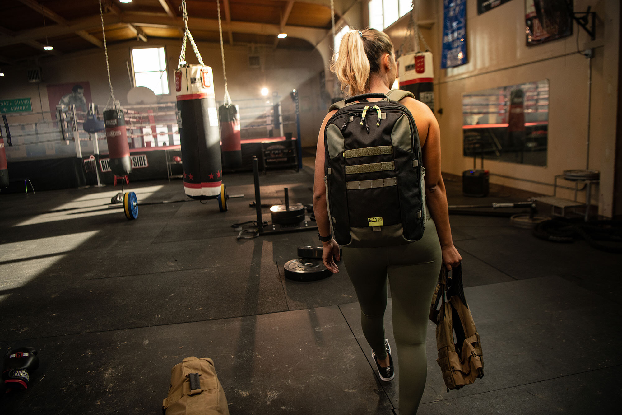 Compact 5.11 PT-R backpack for the gym with removable compression straps for attaching larger equipment such as training vest or yoga mat.