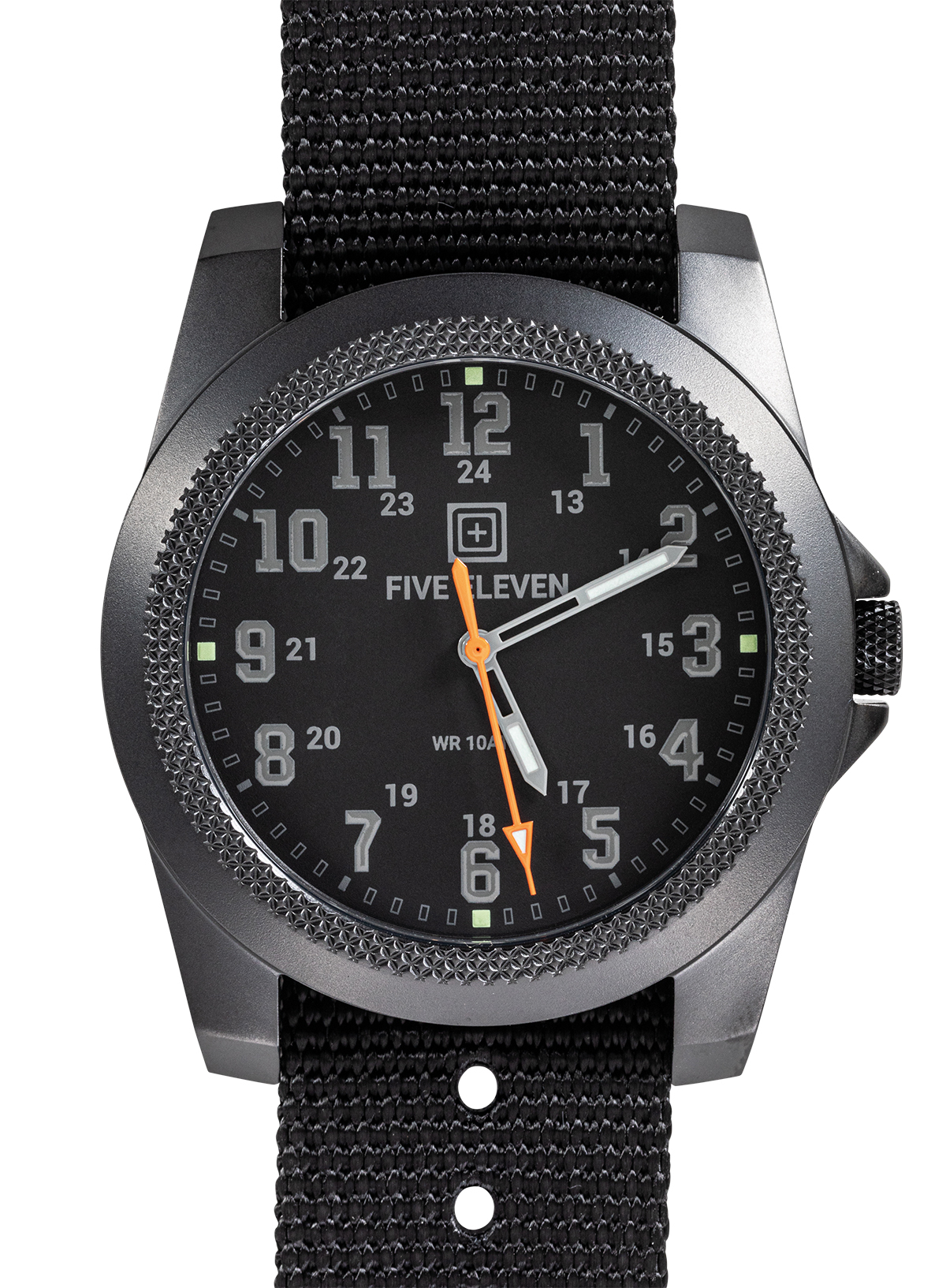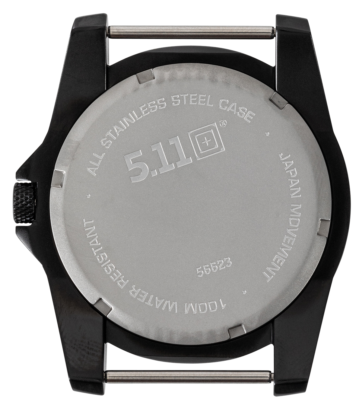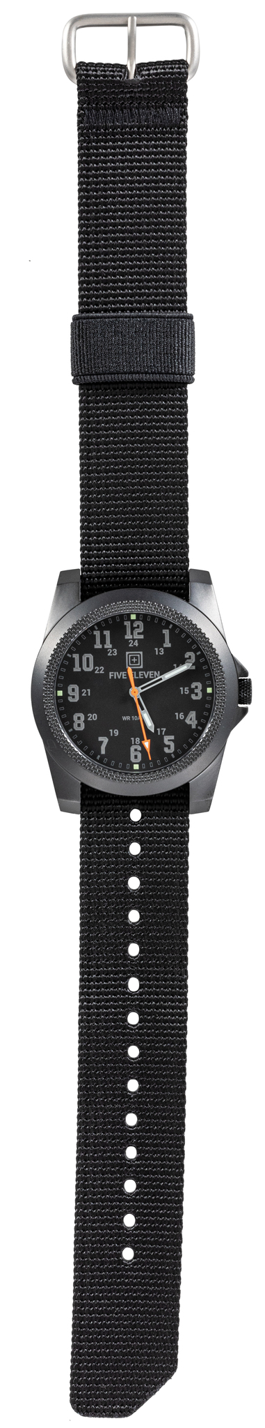 The 5.11 Tactical Pathfinder watch is inspired by military watches worn around the world, where a utilitarian, no-nonsense approach and reliability in hostile environments are key. Phosphorescent quarter markers provide legibility in low-light conditions. A stainless steel case with a matte ion-plated finish and scratch-resistant mineral crystal protects the watch's reliable Japanese movement. This watch equipped with a durable nylon strap.