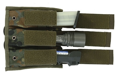 The 75Tactical MX3/3 is designed to hold three magazines. The MX3/2 is designed to hold three magazines: P8, MP7, MP9,.... this is made possible by a 2 cm rubber compression strap. The MX3/3 is closed or opened with a height-adjustable Velcro cover with expansion strap, (removable cover, so as to gain immediate access, for example, in a tactical operation), water eyelet. Dimensions: approx. (H) 12.5/18.5 x (W) 17 x (D) 3 cm. The TecSys plastic clip with safety function allows modular use, suitable for all systems with a 25 mm socket and for any belt or belt sling. Available in four colors. Manufactured according to military specifications from original material in identical quality and grade.