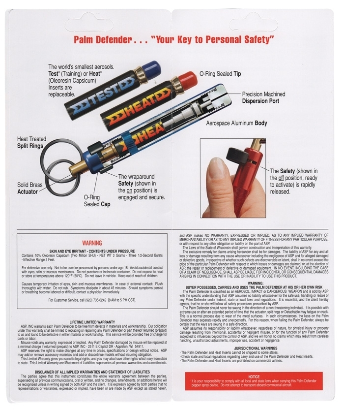 The ASP Palm Defender is the perfect tool to protect yourself inconspicuously due to its hidden function as a pepper spray. The ASP Palm Defender's aircraft aluminum housing conceals a Heat® cartridge (10% Oleoresin Capsicum). With up to 3 short bursts as a spray up to 2 meters range, the defense of an attacker is very simple and safe. The ASP Palm Defender also has a very good safety device to prevent accidental triggering. With only one thumb movement, the safety is released in a flash and the pepper spray is ready for use. The Palm Defender can be used as a traditional Kubotan and can therefore be used as a pressure booster for blows or nerve press.