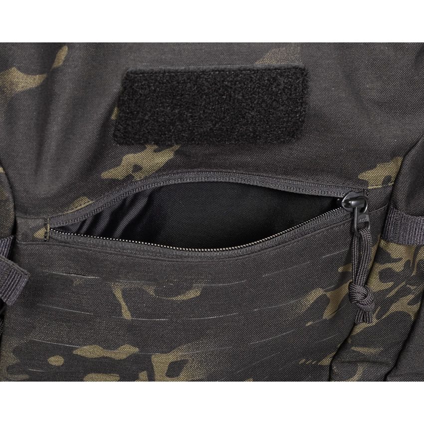The TT Mission Pack MK II offers several inner pockets and also features MOLLE hook-and-loop lining in the main compartment for individual loading or modular extensions. On the sides and the flat zip front pocket the backpack is equipped with MOLLE in lasercut design. A side zip pocket, accessible from the outside, is provided for documents. The backpack has three tube or antenna openings in the main compartments, so that a drinking bladder can also be accommodated. A rain cover is stowed in the bottom compartment. The hip wings with zip pockets are removable.
