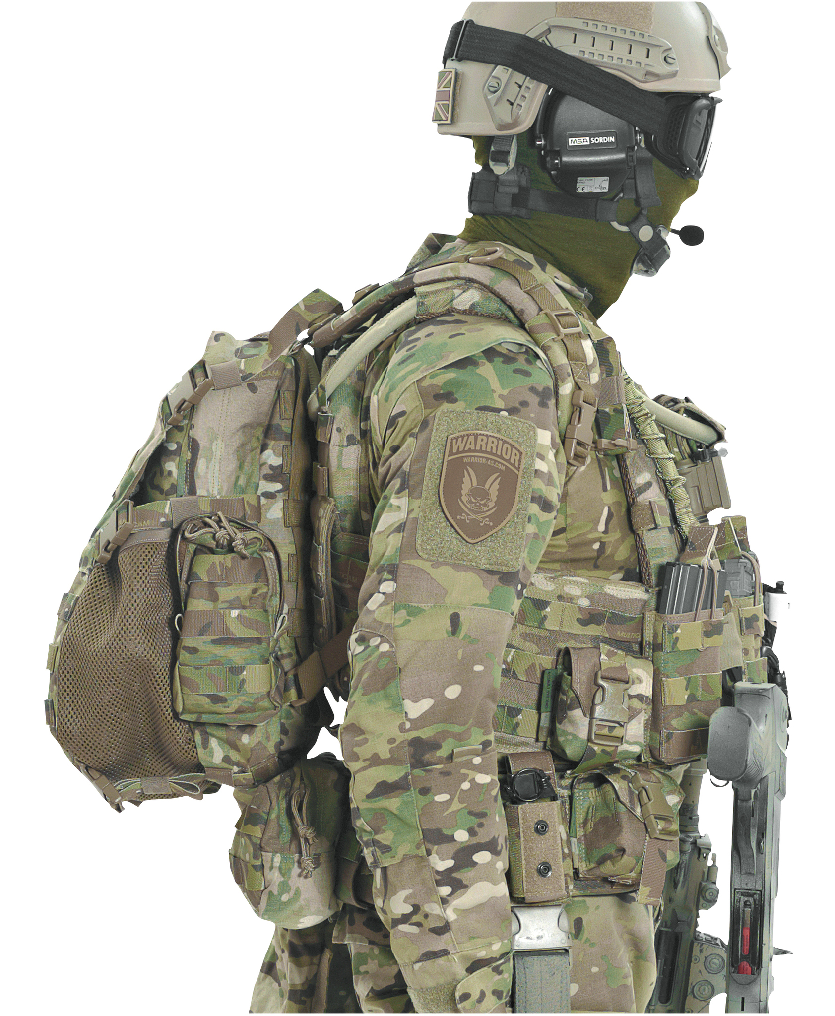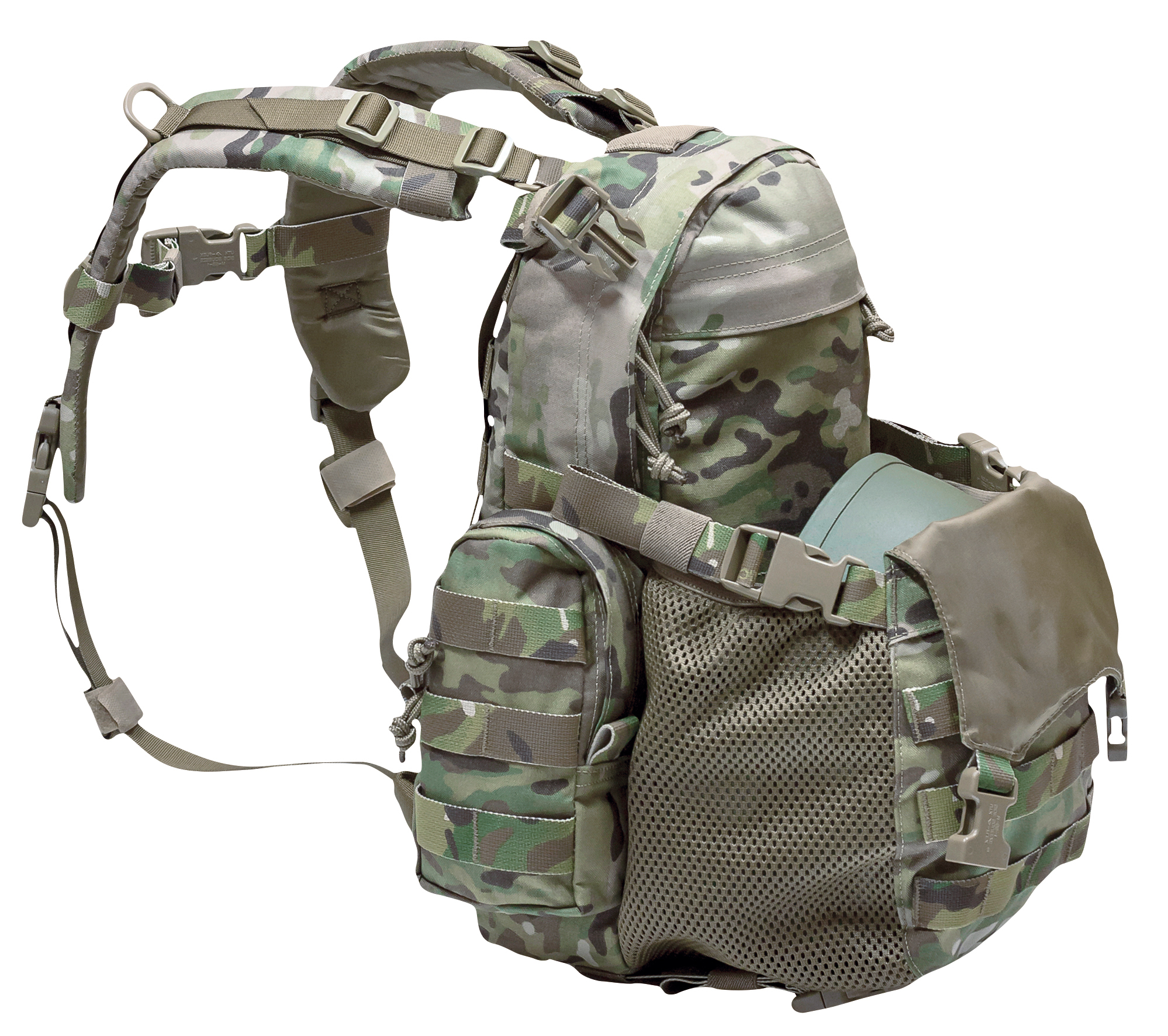 Flexible 12 liter backpack, which can optionally be looped directly onto the back of a modular vest. The large mesh pocket on the front, adjustable by compression straps, is used to hold the combat helmet, but also proves extremely useful for storing a waterproof jacket or similar.