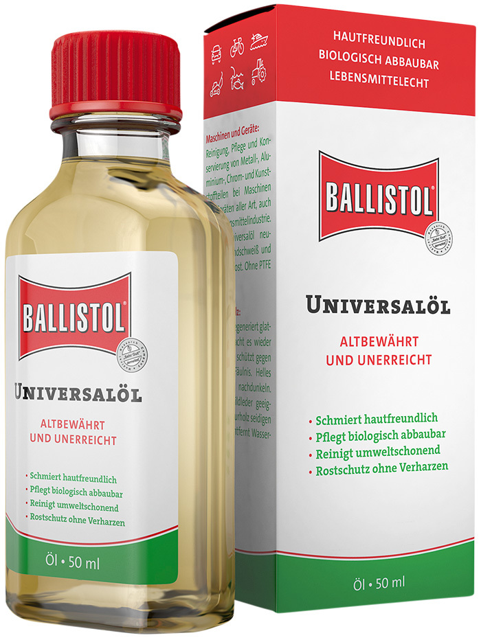 The classic among the all-round remedies. The active ingredients are of natural origin, the base oil is medically pure white oil. Ballistol is absolutely resin- and acid-free and resistant to aging. All ingredients are biodegradable and harmless to the environment. Ballistol creeps into the tightest nooks and crannies due to its low surface tension, lubricating and protecting excellently. It also effectively protects leather against drying out, water and other damage. Ballistol regenerates brittle, dry leather and makes it soft and elastic. Likewise, wood is protected by Ballistol. It deepens the grain and protects against moisture and rot. For a variety of applications such as outdoor, leisure, sports, everyday and professional. Makes rubber supple, squeaky joints quiet, jammed bearings common, protects metal and plastic.