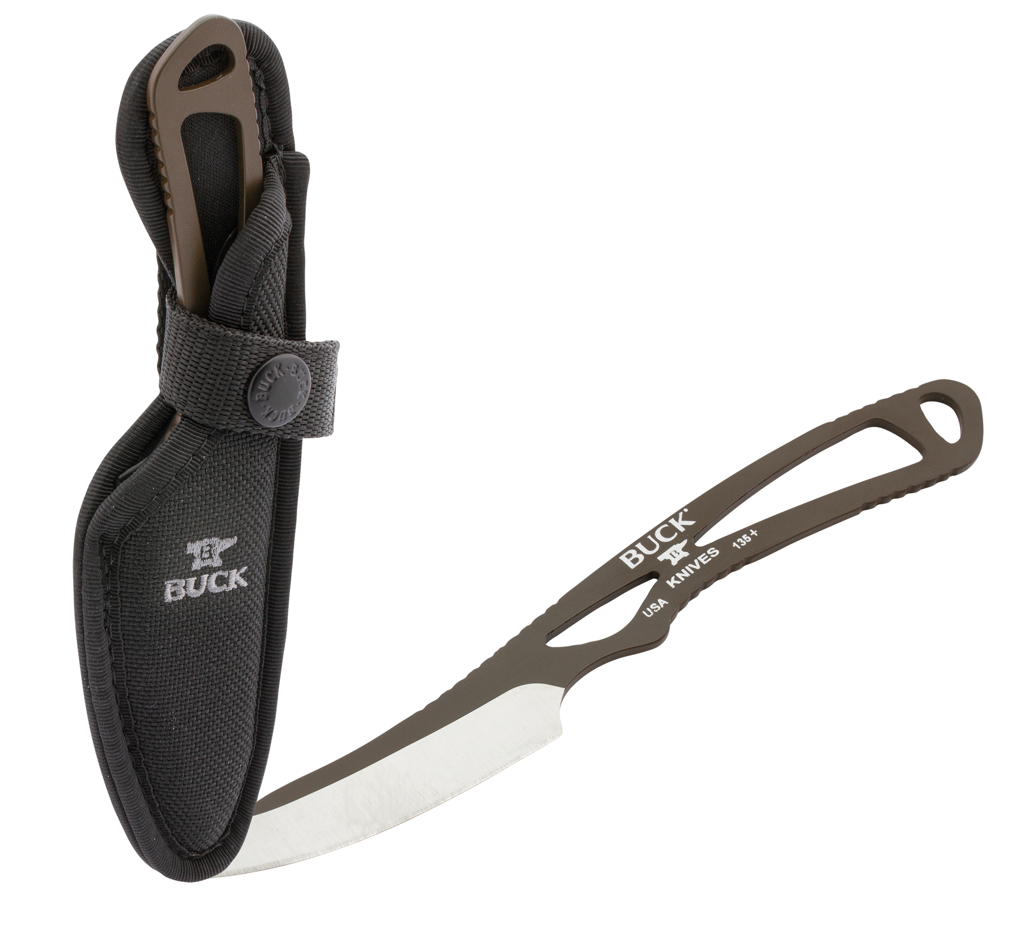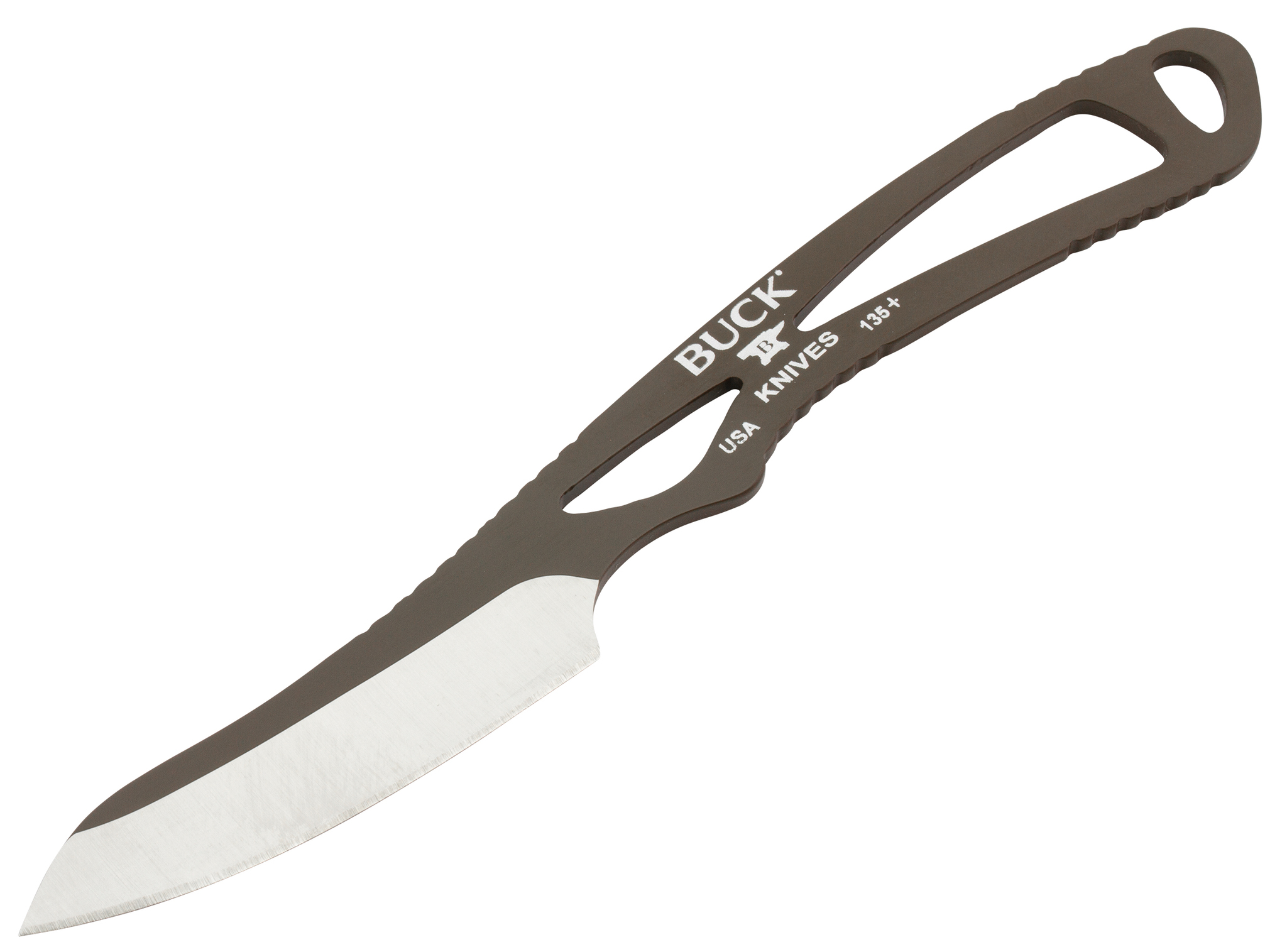 The Buck 135 Paklite Caper skeletonized hunting knife has a handle and blade made from one piece of steel. It is ideal for processing birds and small game.