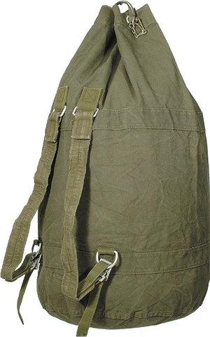 Rugged German Army duffel bag with duffel closure strap in used condition.