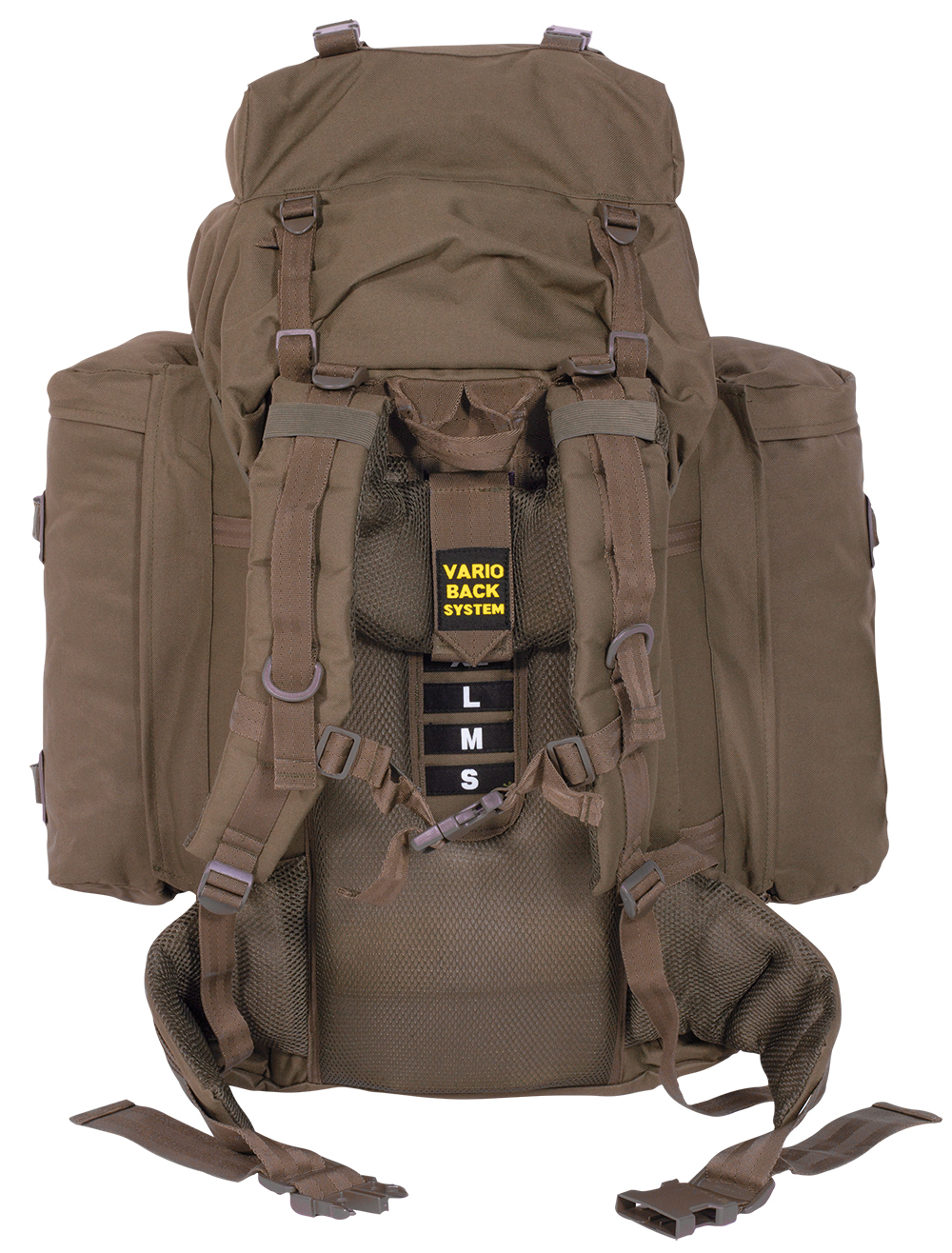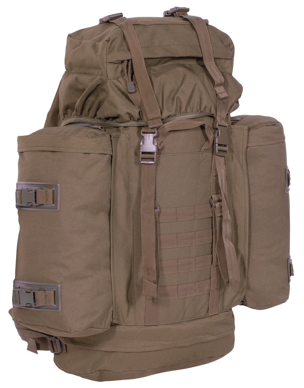 Large backpack with removable side pockets. The BW Mountain has a comfortable and height-adjustable carrying system with integrated aluminum frame for stabilization. The large 80 liter main compartment is accessible from the top and via the sleeping bag compartment. The two side pockets with 10 liters each can be used individually or zipped together as a daypack. In addition to the lid compartment, the BW Mountain also has attachment straps and MOLLE webbing for attaching additional gear.