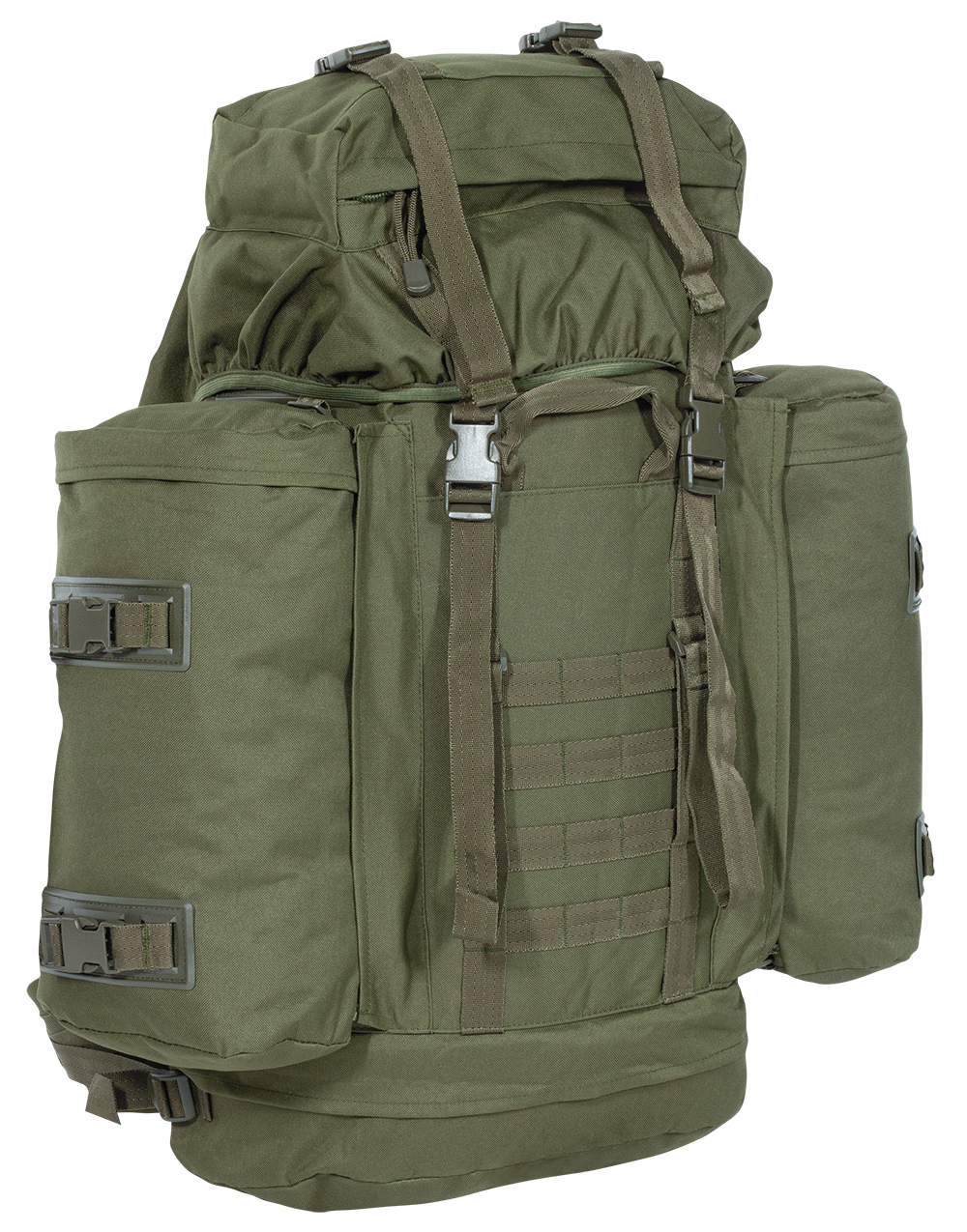 Large backpack with removable side pockets. The BW Mountain has a comfortable and height-adjustable carrying system with integrated aluminum frame for stabilization. The large 80 liter main compartment is accessible from the top and via the sleeping bag compartment. The two side pockets with 10 liters each can be used individually or zipped together as a daypack. In addition to the lid compartment, the BW Mountain also has attachment straps and MOLLE webbing for attaching additional gear.