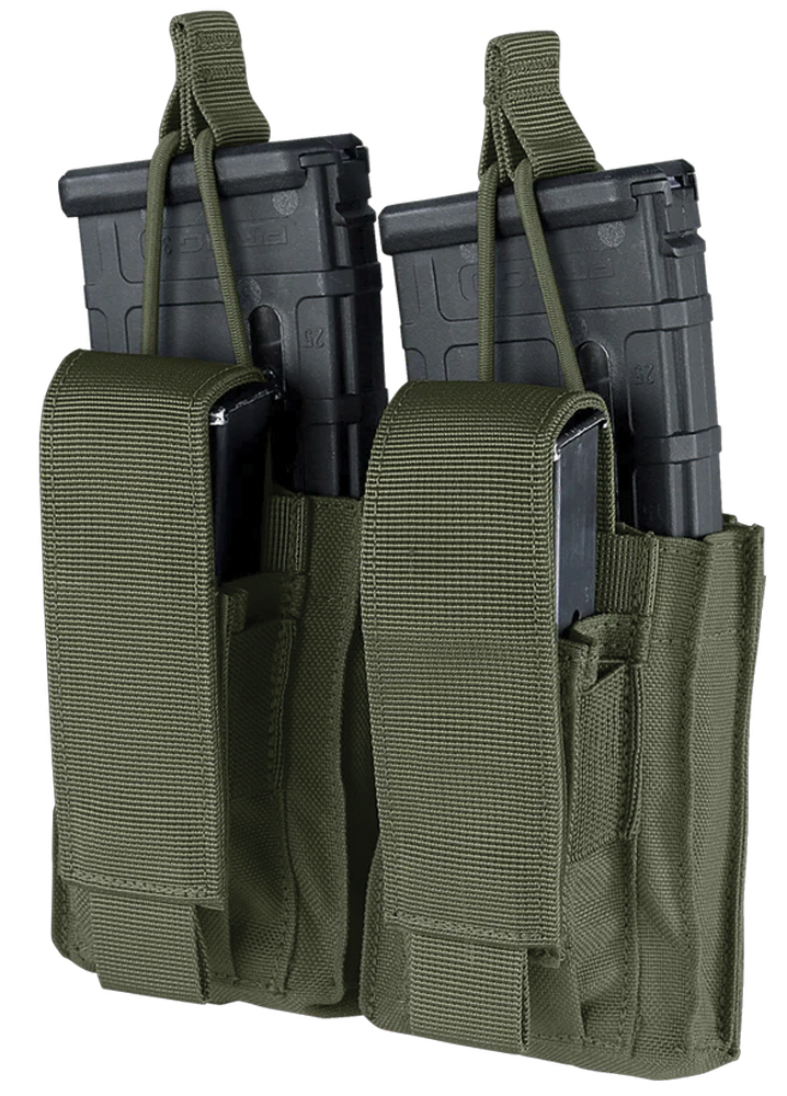 The Condor Double Kangaroo Mag Pouch Gen II magazine pouch holds two AR / M4 magazines and two pistol magazines in a convenient modular attachment. The simple, effective design includes an open bungee mount and adjustable flap closures to ensure magazines stay securely stowed inside and can be deployed in no time. The back of the magazine pouch features laser cut MOLLE to improve durability and weight. The Condor Double Kangaroo Magazine Pouch is compatible with MOLLE webbing and easily attaches to your plate carrier or chest rig in a variety of locations.