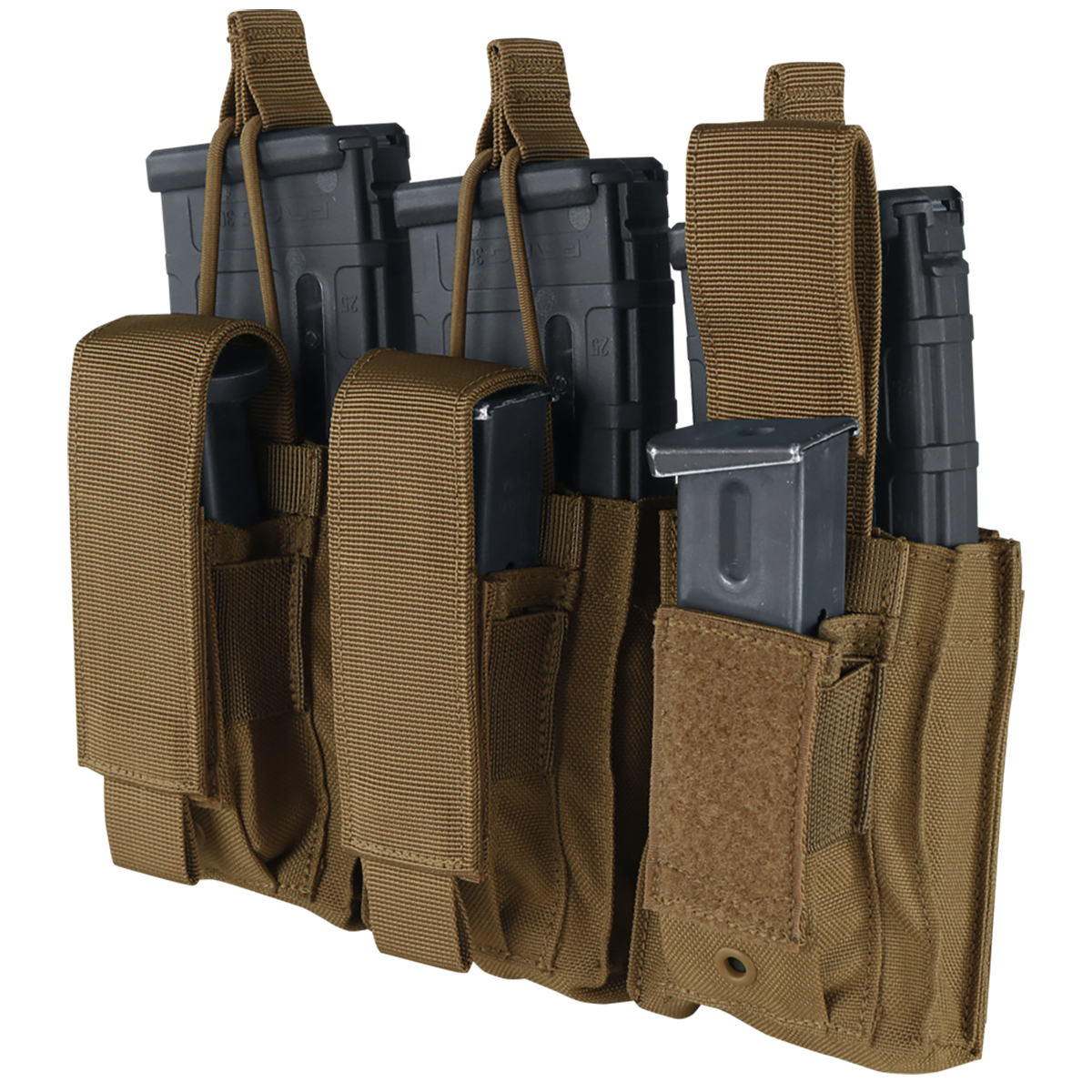 The Condor Triple Kangaroo Mag Pouch Gen II magazine pouch holds three AR / M4 magazines and three pistol magazines in a convenient modular attachment