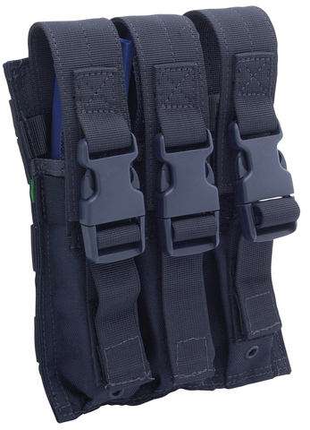 Magazine pouch for 3 pieces MP5 magazines with removable and height adjustable closure tabs. The closure tabs have Velcro and quick release fasteners.