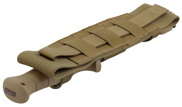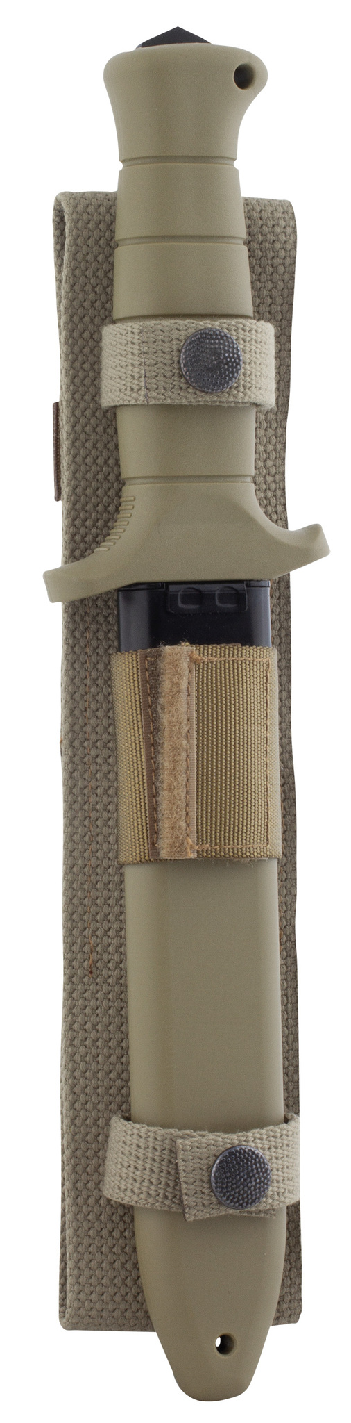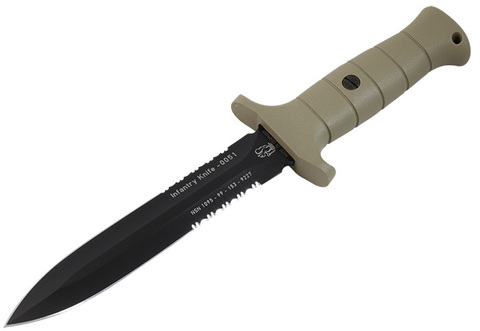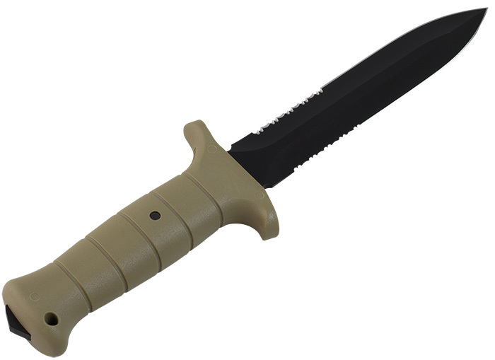 The Eickhorn Goldsack Infantry Knife was developed for the British infantry as a new multi-purpose and rescue knife and was the only knife to pass the rigorous British testing procedures. This functional knife outshines all its competitors. It is supplied in a custom color to suit the needs of the British Army. The tang of the blade is made of stainless 1.4110 steel (HRC 54-56) and runs through the entire handle, peeking out at the rear end. This allows the handle end to be used for hammering or breaking window glass. The blade has a hollow grind and is honed on both sides. The handle is made of fiberglass reinforced nylon with finger guards on both sides and is extremely easy to grip, even with wet hands and gloves.