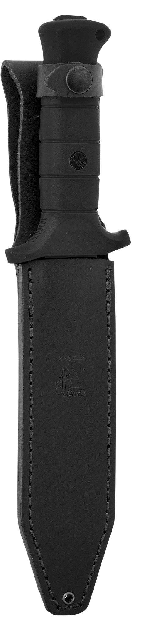 The Wolverine Pilots Knife (WPK) is an extremely robust work and outdoor knife and is Eickhorn's modern interpretation of the crosscut knife "flying personnel". Here, a number of required components were reduced, an ergonomic plastic handle and modern materials were introduced. These modifications result in a universal companion for all occasions. The tang of the blade made of stainless 1.4110 steel (HRC 54-56) runs through the entire handle and peeks out at the rear end. This allows the end of the handle to be used for hammering or breaking window glass. To increase corrosion resistance and at the same time make it easier to maintain the blade, the entire surface has been ceramic blasted, which also prevents stronger reflections. The fiberglass reinforced nylon handle with finger guards on both sides is extremely easy to grip and provides a good grip even with wet hands and gloves. The knife comes with a sturdy leather sheath with belt loop.
