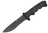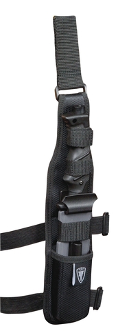 The sturdy, matte black 440 stainless steel blade has a partial serrated edge; the continuous tang is bolted to the end of the TPR-coated molded plastic handle, creating an extremely resilient unit. The EF 703 Kit's multi-function sheath attaches with three loops in a nylon thigh-carry system and has a mount for the included firestarter and an integrated sharpening surface.