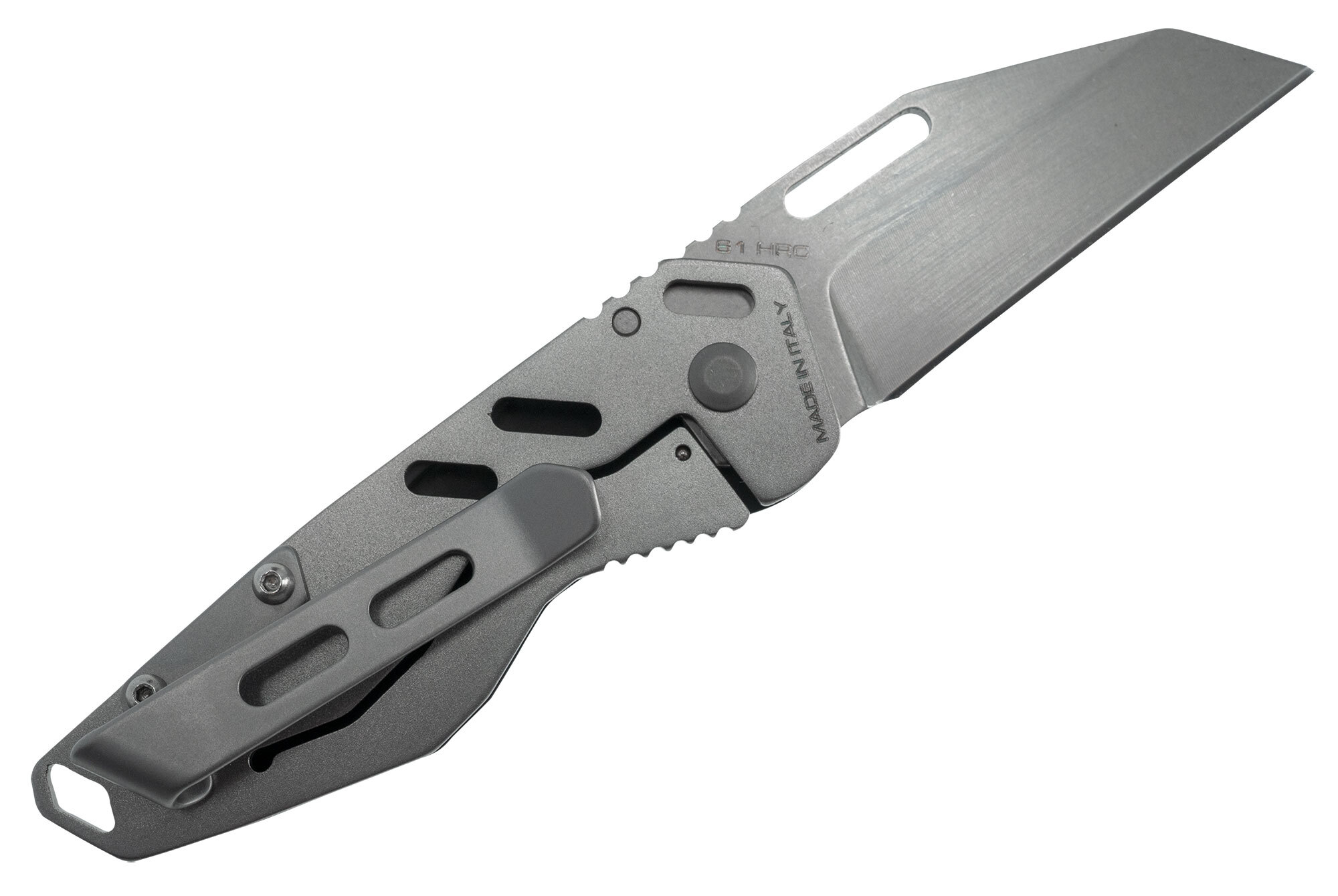 The handle consists of two different elements: the scale made of anodized, anticorodal aluminium and the frame made of heat-treated, hardened Böhler M390 steel with 61HRC! The handle also performs the function of locking the blade (frame lock system). This mechanism requires part of the frame to be folded inwards to lock the blade firmly in the open position, thus increasing the operator's safety when using the knife. At the end of the handle is a loop for inserting a lanyard, and on the right side of the handle is a steel clip that allows concealed carry in a pocket.