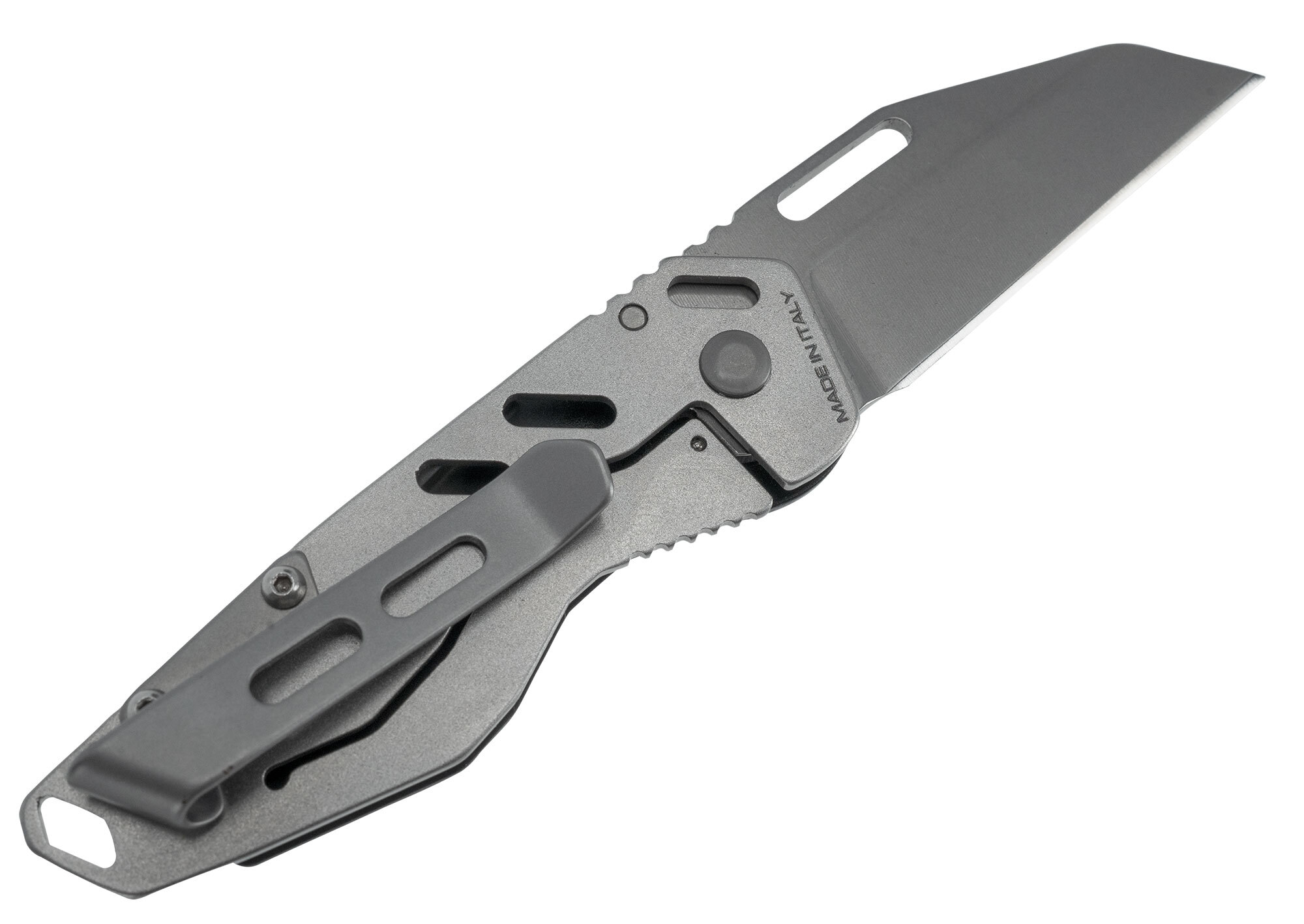 The handle consists of two different elements: the scale made of anodized, anticorodal aluminium and the frame made of hardened steel, which also acts as the blade lock (Frame Lock System). This mechanism requires part of the frame to be folded inwards to lock the blade firmly in the open position, thus increasing the operator's safety when using the knife. At the end of the handle is a loop for inserting a lanyard, and on the right side of the handle is a steel clip that allows concealed carry in a pocket.
