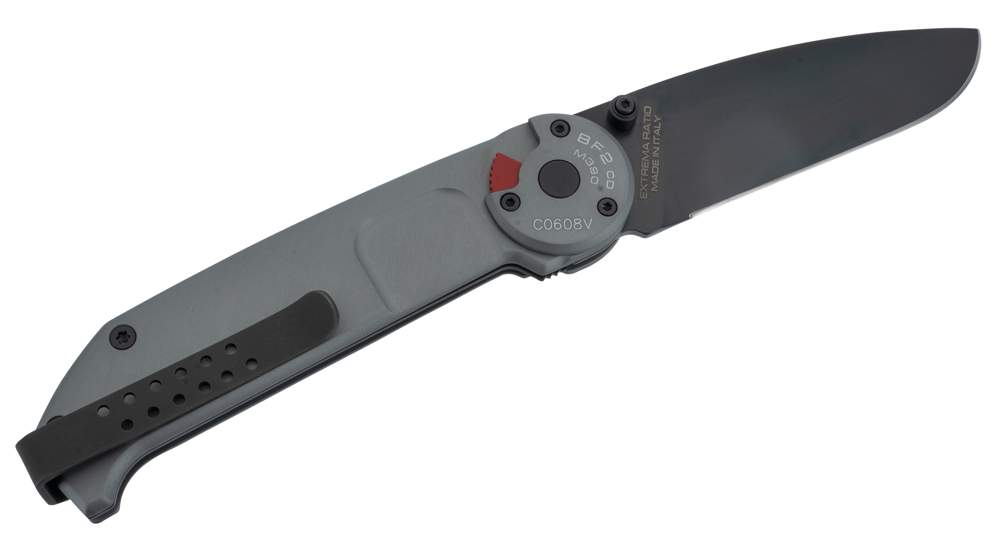 The Extrema Ratio® BF2 has a blade made of Böhler N690 steel (58HRC) with a liner lock, a flat grind and a thick, durable tip. The handle has a lowered flat area for the thumb in the handle and pins that do not protrude from the knife. The interchangeable clip is located on the back and allows the knife to be carried discreetly. In addition to the liner lock, the BF2 also has a manual lock. The BF2 can be completely disassembled for maintenance.