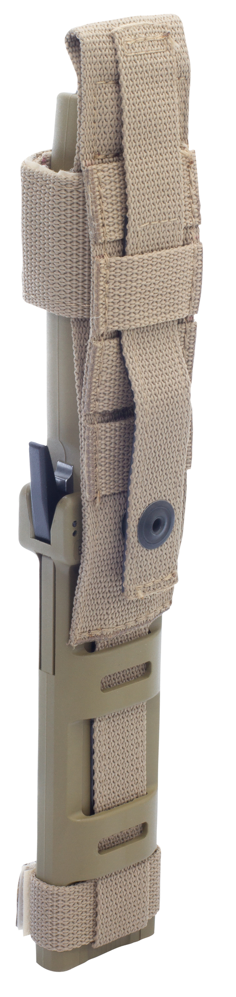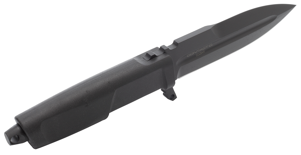 The Extrema Ratio Contact C is the compact version of the Contact combat knife and features a Boehler N690 steel spearpoint blade. The Forprene handle is attached by a threaded tang, which makes the knife robust and well balanced. The MOLLE-compatible, injection-molded nylon sheath features a shock-absorbing system to prevent rattling, a double-button safety loop, a rubberized tight beingurt and a retention lock that is released by simply pressing the trigger-like lever.