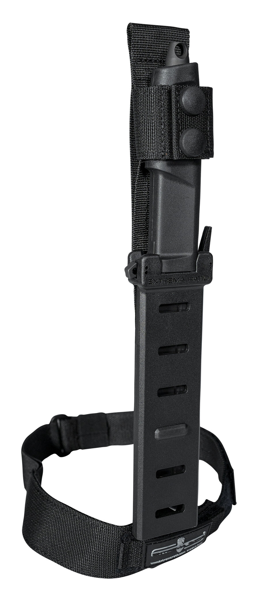 The full flat grind of the Extrema Ratio DPM ensures excellent cutting properties with maximum durability of the extra strong blade. The scabbard is kept minimalistic; however, it still offers all functions to meet the requirements of different carrying methods. It can be worn on belts and belt couplers as well as on MOLLE systems.