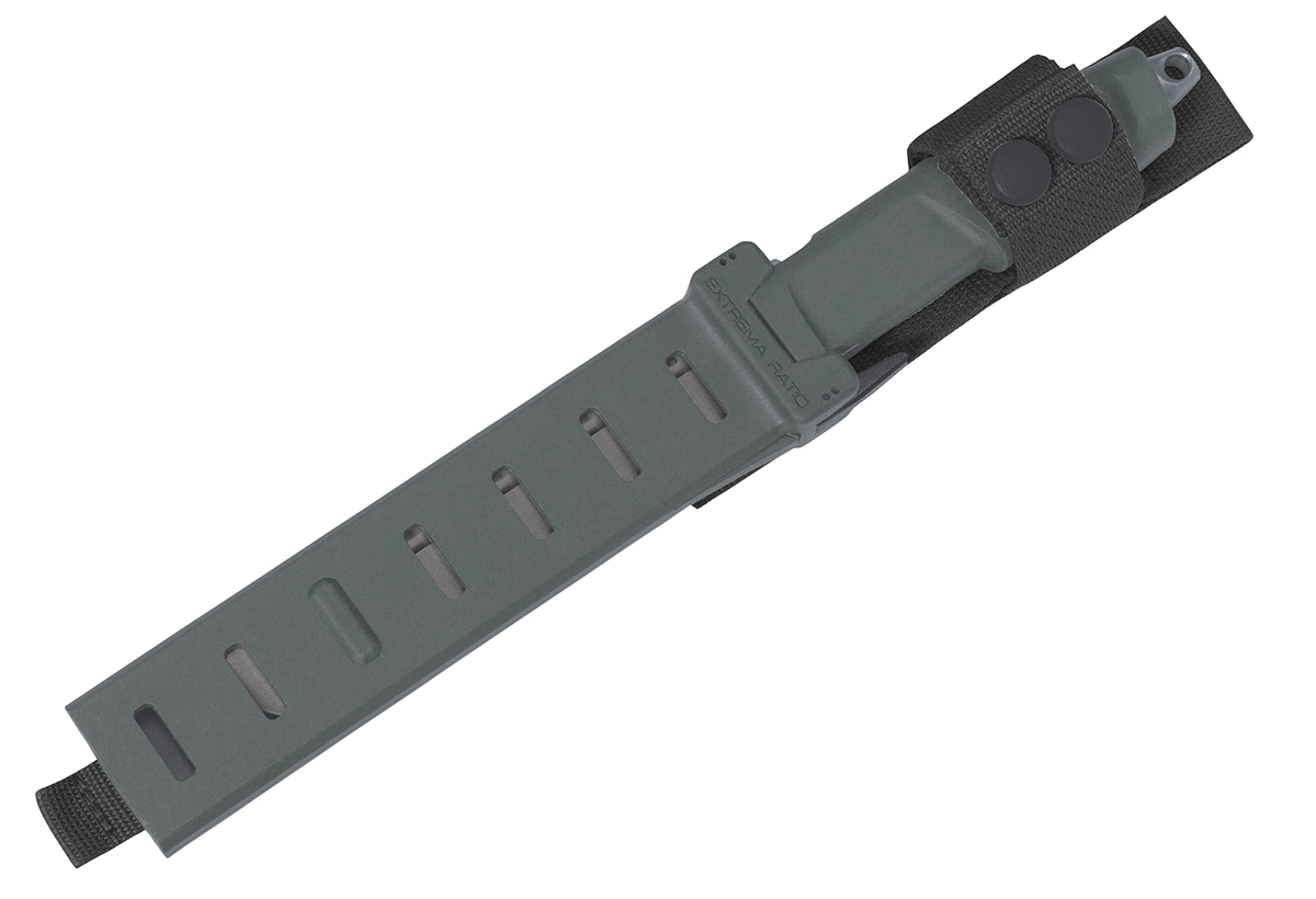 The Extrema Ratio Giant Mamba has a 6.3mm thick, 58 HRC Boehler N690 steel tanto blade with a smooth edge and full length. The forprene handle is secured by a threaded tang that makes the knife sturdy and well balanced. The injection molded nylon with impact quality, MOLLE compatible sheath features a shock absorbing system to prevent rattling, a double button safety loop, a rubberized thigh strap and a retention safety that is released by simply pressing the trigger-like lever. The new knife line minimizes strength and bulk without sacrificing ruggedness and safety.