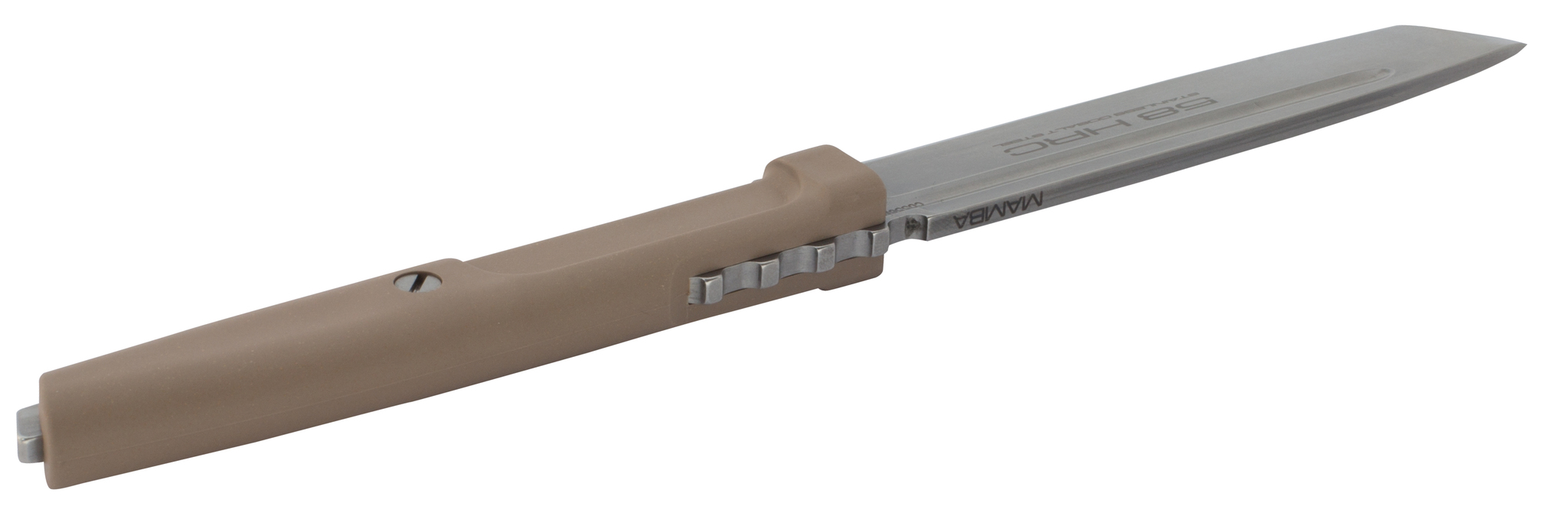 The very light Extrema Ratio® Mamba has a very slim blade in classic Tanto style and a Molle compatible plastic sheath. The handle is made of Forprene with a spike at the end of the handle which can be used as a glass breaker. The innovative Kydex sheath has a safety lock that can be operated with the thumb to ensure quick removal in one fluid motion. The sheath is also equipped with a MOLLE/ PALS attachment system.