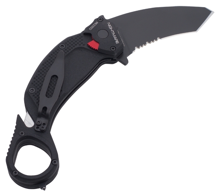 The Extrema Ratio Medium Folder Nightmare is an insert knife in classic carambit form with a tanto blade and partial serrated edge