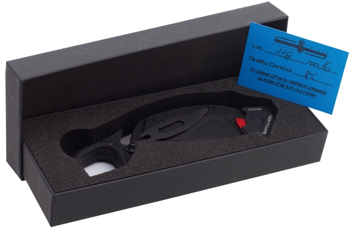 The Nightmare has a wide tanto blade with a partial serrated edge. The handle scales have a rough, anti-slip coating. Incorporated are a glass breaker spike at the end of the handle and a belt cutter. The innovative adjustment screw can be used to set the opening speed of the blade. The knife can be completely disassembled for maintenance.