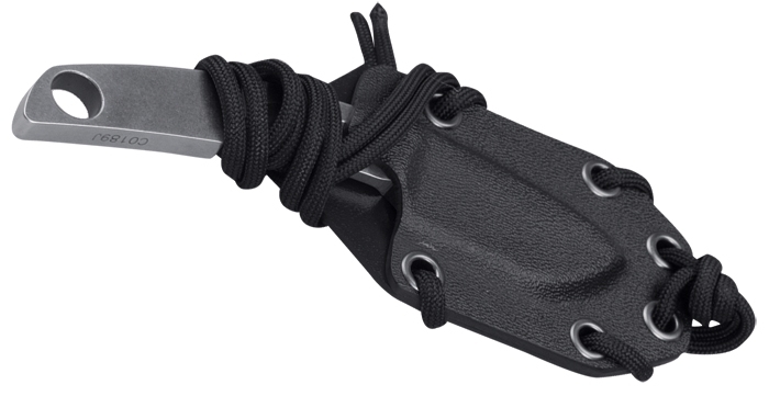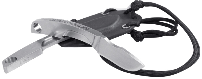 The Extrema Ratio® Kneck Knife N.K.1 with Stone Washed blade finish is based on the Skinner hunting knife type. The design of the handle prevents accidental injury when drawing. A recess on the back of the blade has a rest for the index finger or thumb to apply optimum pressure on the blade. Due to its overall construction, the N.K.1 is suitable for very effective precision work. The included Kydex sheath comes with a paracord cord. The paracord can also be used to attach the Kydex sheath to MOLLE system, tactical vests or to one of Extrema Ratio®'s compatible Cordura sheaths.