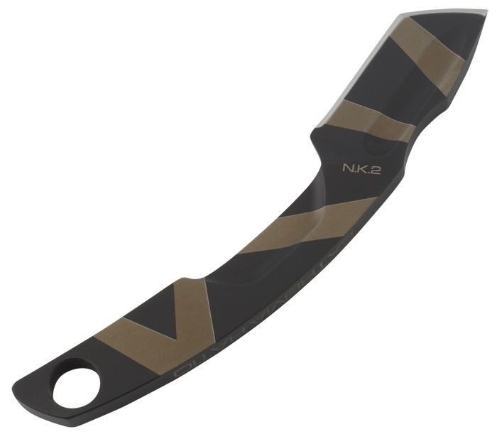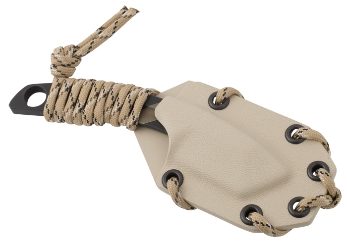 The N.K.2 with Desert Warfare Laser Finish is the middle version from the Extrema Ratio® Kneck Knife series. The main differences to the predecessor N.K.1 is the tanto blade and the blood groove. The design of the handle prevents accidental injuries when drawing. A recess on the 6.3 mm thick blade back has a rest for the index finger or thumb to apply optimal pressure on the blade. Due to its overall construction, the N.K.2 is suitable for very effective precision work. The included Kydex sheath comes with a paracord cord. The paracord can also be used to attach the Kydex sheath to MOLLE system, tactical vests or to one of Extrema Ratio®'s compatible Cordura sheaths.