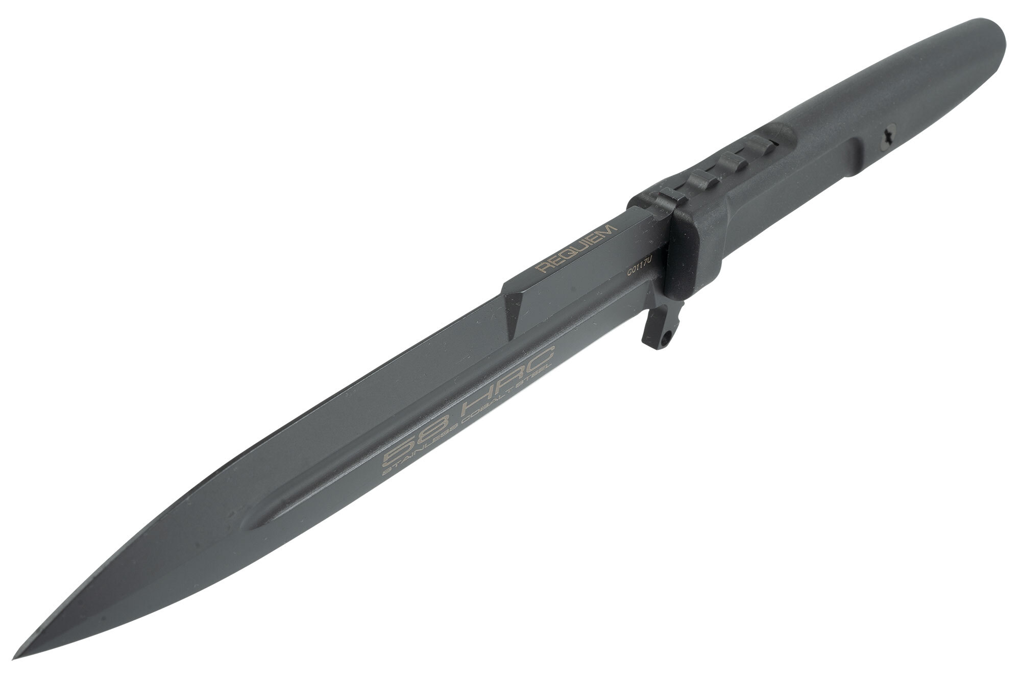 The very lightweight Extrema Ratio® Requiem has a very slim single-edge blade and a MOLLE-compatible plastic sheath. The innovative Kydex sheath has a safety lock that can be operated with the thumb to ensure quick removal in one fluid motion. The sheath is also equipped with a MOLLE/ PALS attachment system.