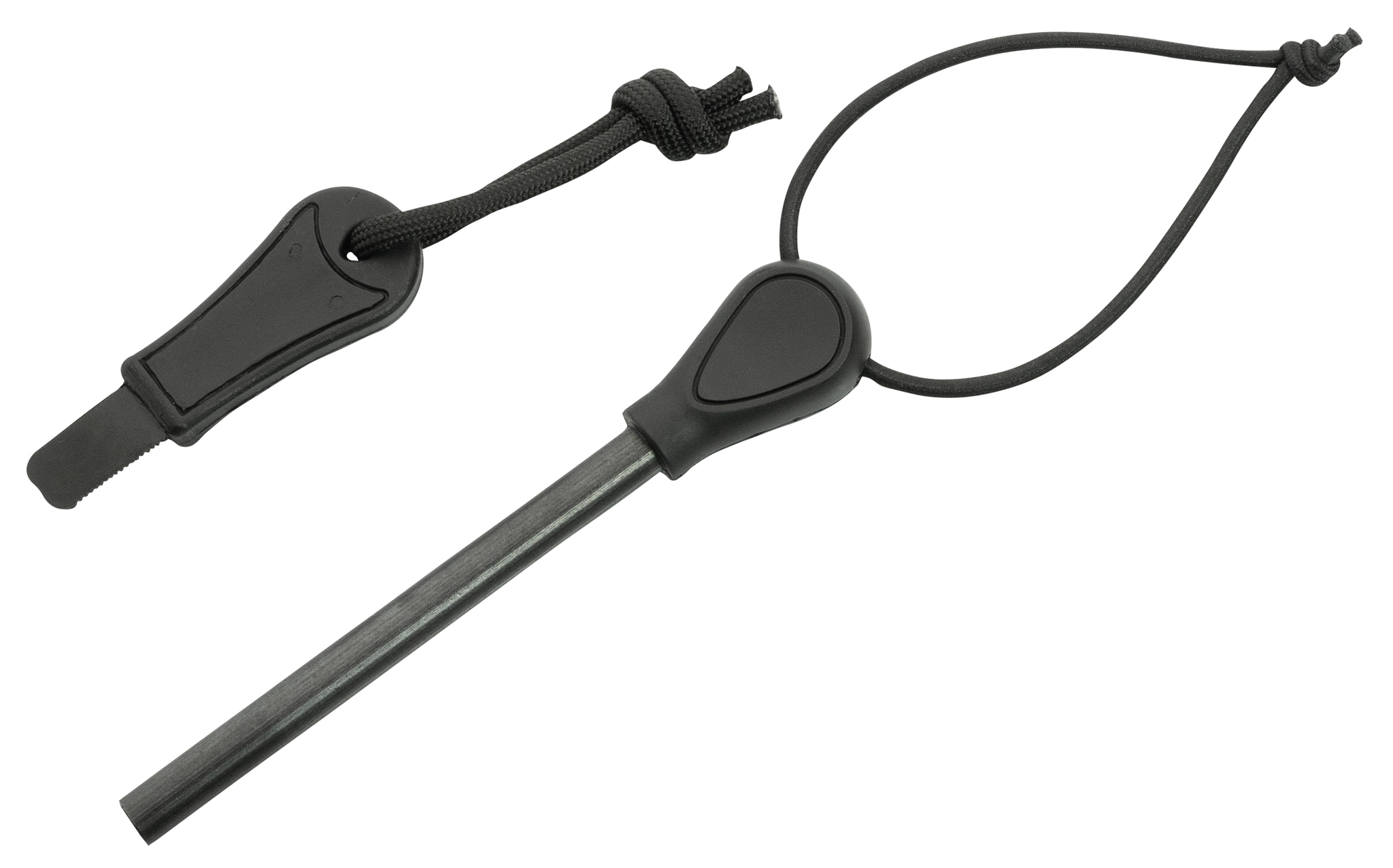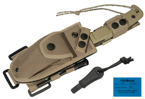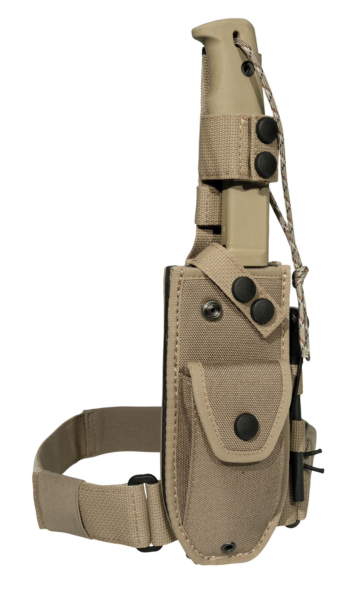 A longer handle and heavier blade allow for improved chopping and cutting capabilities. It comes with a MOLLE-compatible Cordura sheath with leg strap. On it is a small, sturdy pocket of a paracord cord. A Firesteel for lighting fires is included on the side.