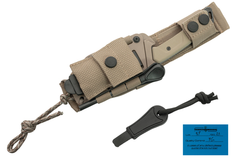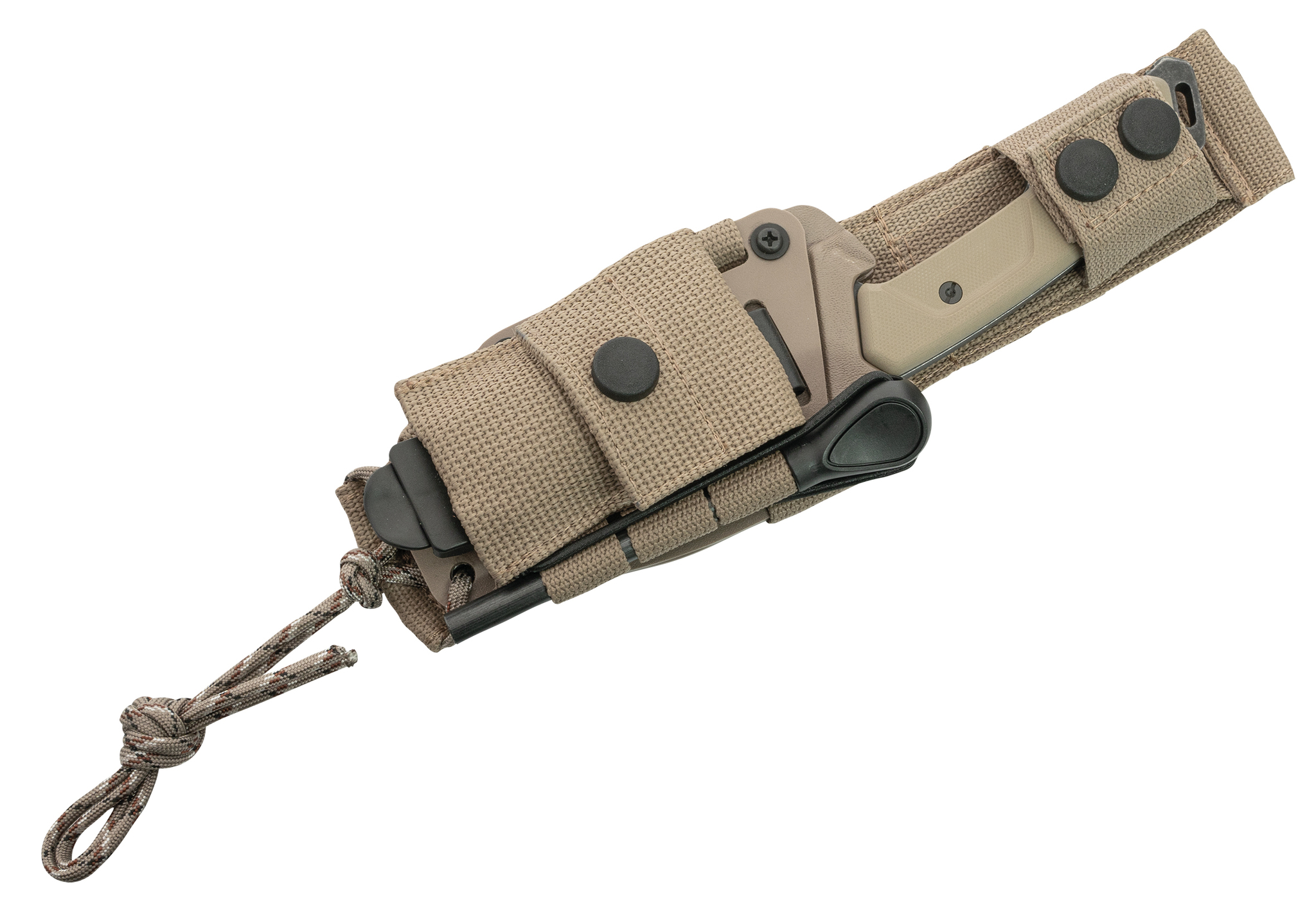 The durable Kydex sheath is looped out onto a sturdy Cordura webbing and can be attached to all M.O.L.L.E. systems. Another Cordura pocket with a paracord for difficult situations is also on the sheath, as well as the Eiresteel including fire starter