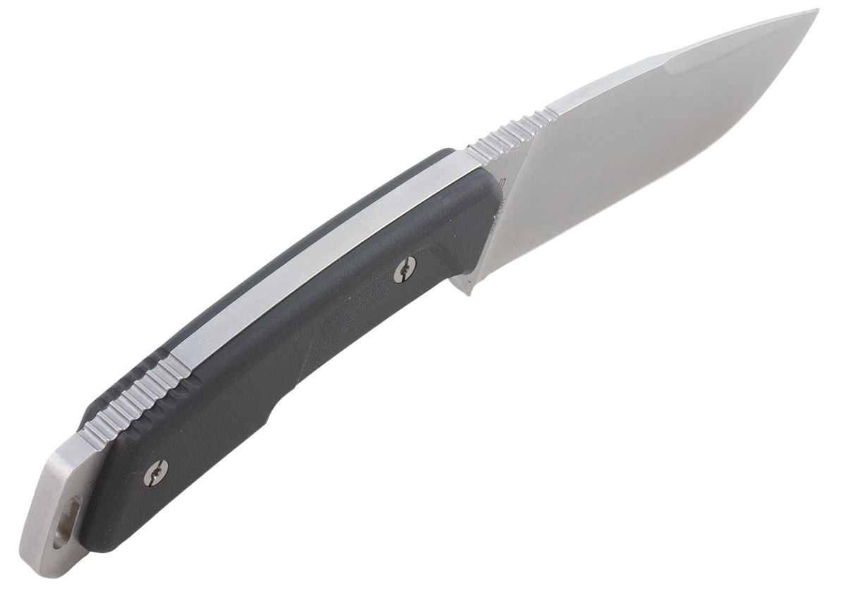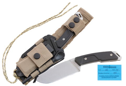 The knife comes with G10 handles that feature the typical ergonomic design of Extrema Ratio handles. The handle scales can be easily removed and replaced with paracord cord. The sheath is made of very lightweight and minimalist Kydex. It can be disassembled and adapted for both left-handed and right-handed users. The Kydex sheath can be attached to belts or MOLLE platforms with the nylon attachment. A 2-component sharpening stone and a fire steel complete the sethlans.