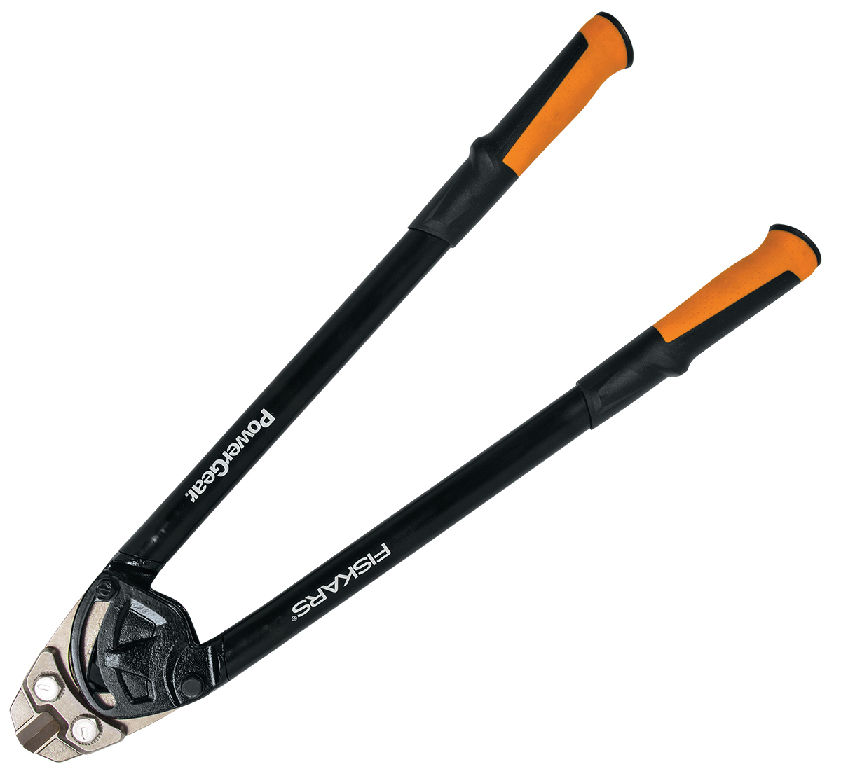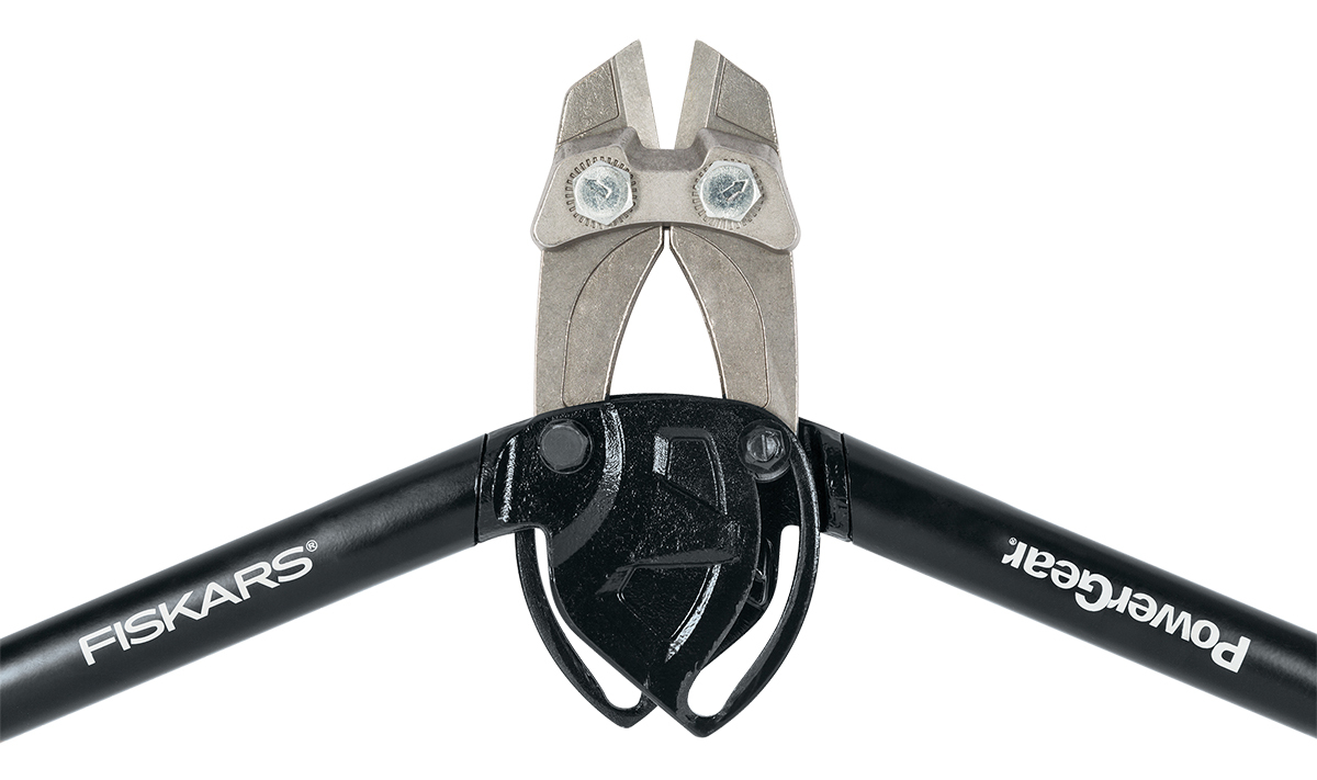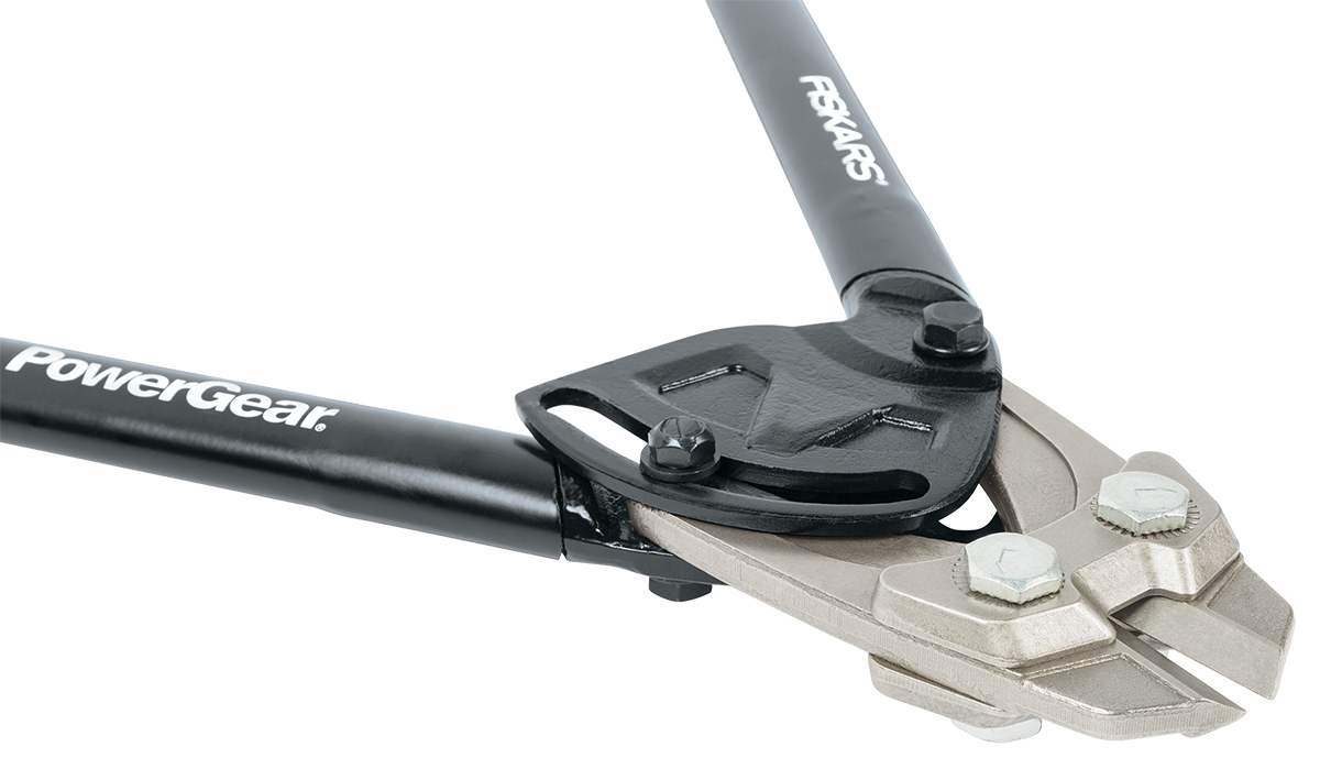 The Fiskars Pro PowerGear™ heavy-duty bolt cutter 61 cm cuts soft materials up to 9.5 mm (<19 HRC) and hard materials up to 6.4 mm (<40 HRC).