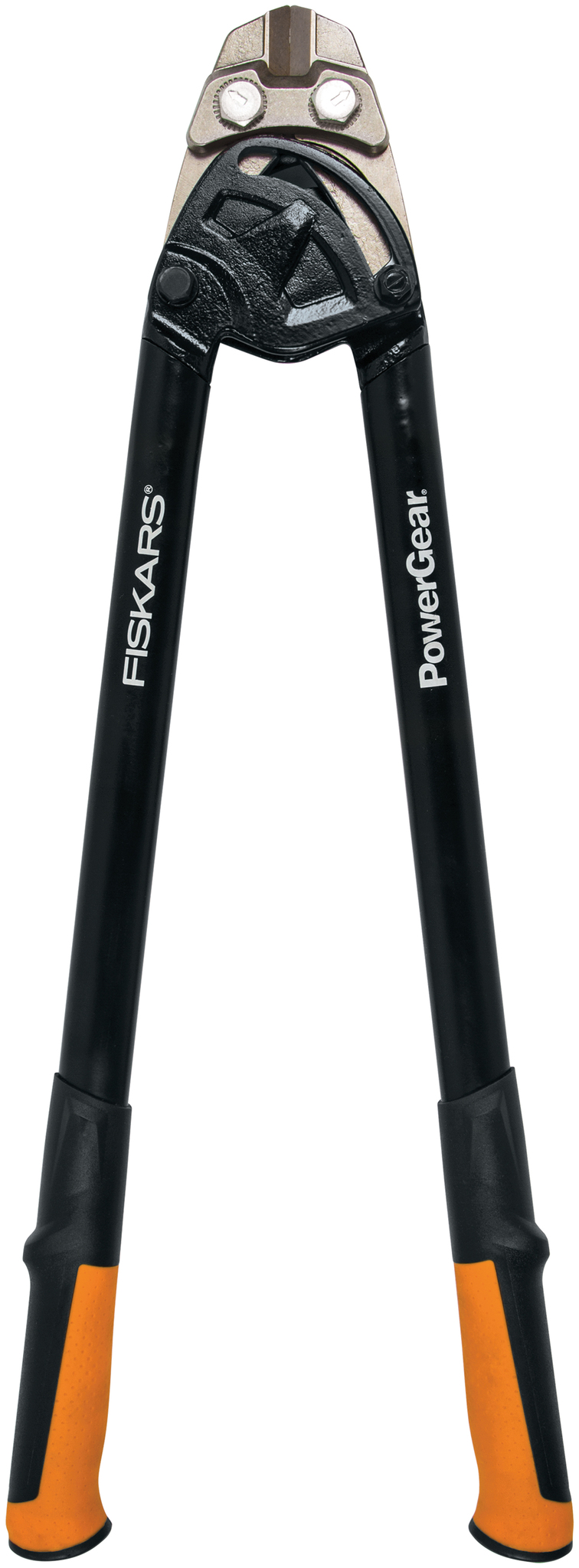 The Fiskars Pro PowerGear™ heavy-duty bolt cutter provides optimum power, comfort, control and easily cuts padlocks, chains and rebar. An adjustment screw optimizes jaw position; forged, tempered blades stay sharp even under heavy use. Ergonomic handles with SoftGrip® enhance comfort and control, while rugged steel construction ensures durable performance. This model cuts soft materials up to 9.5 mm (<19 HRC) and hard materials up to 6.4 mm (<40 HRC).